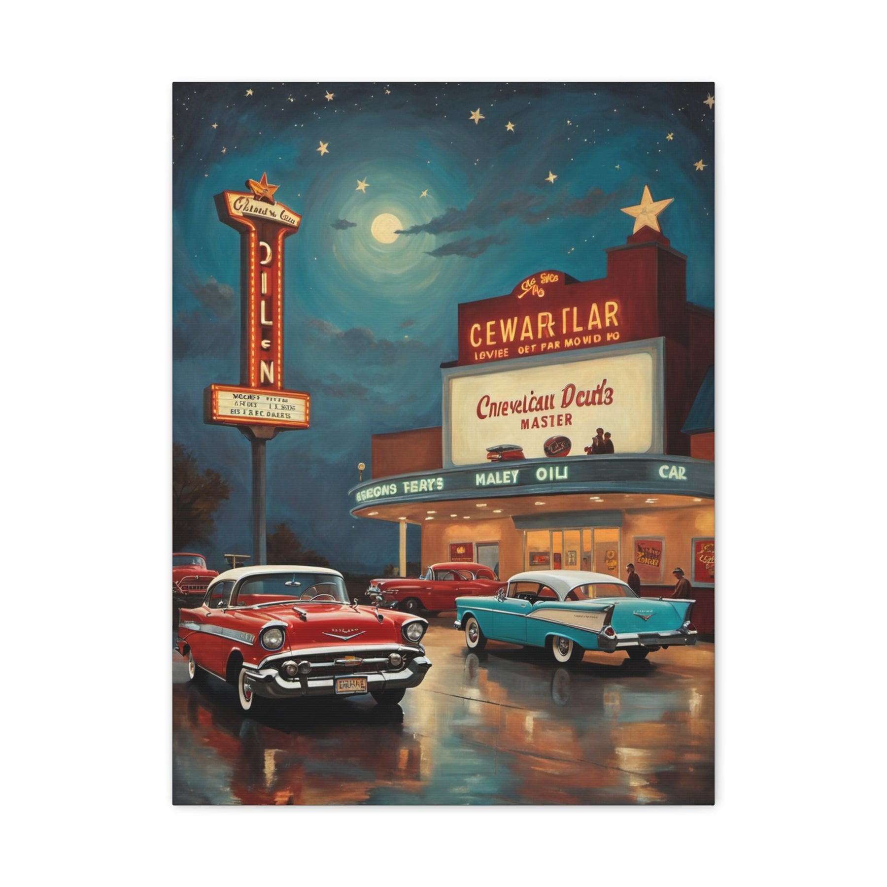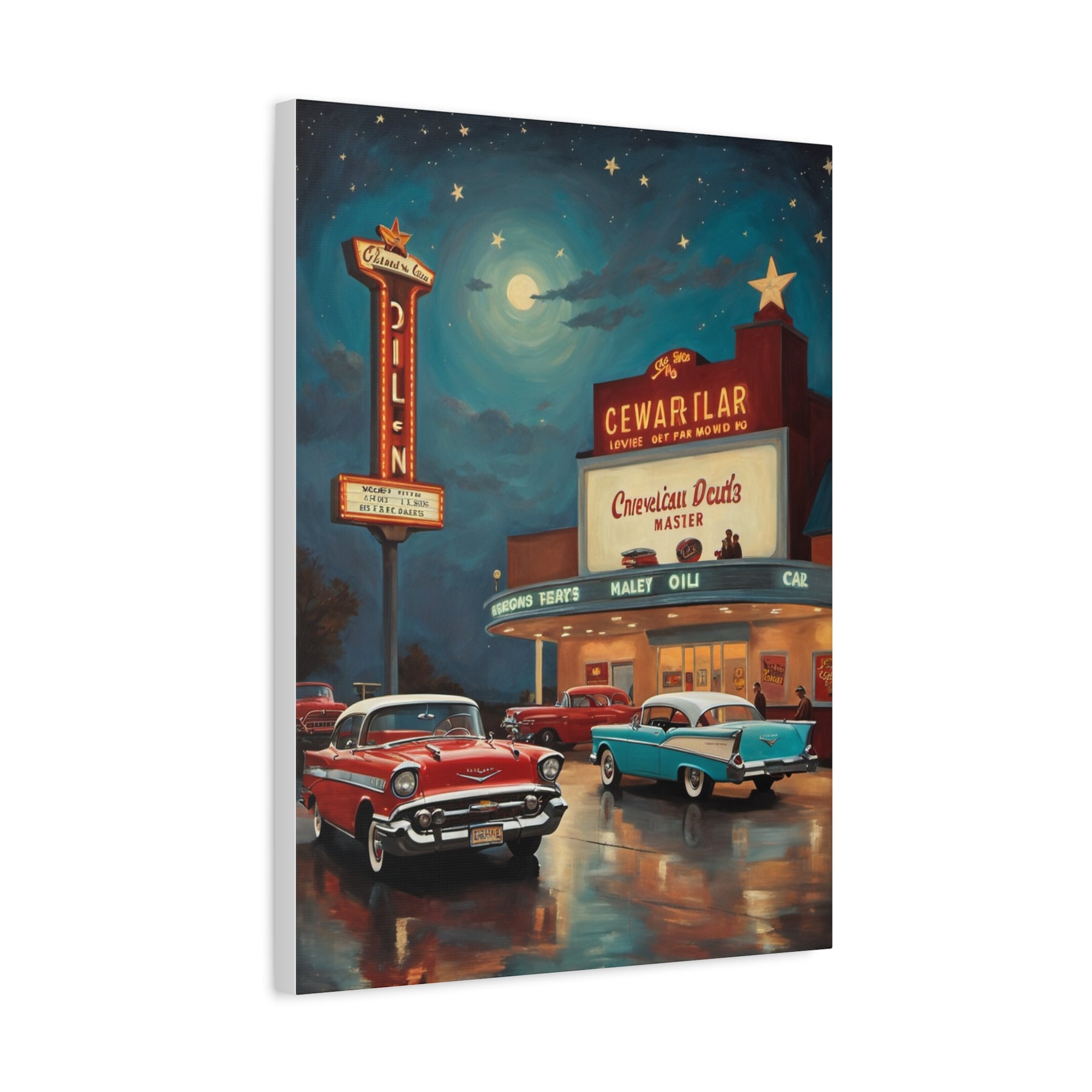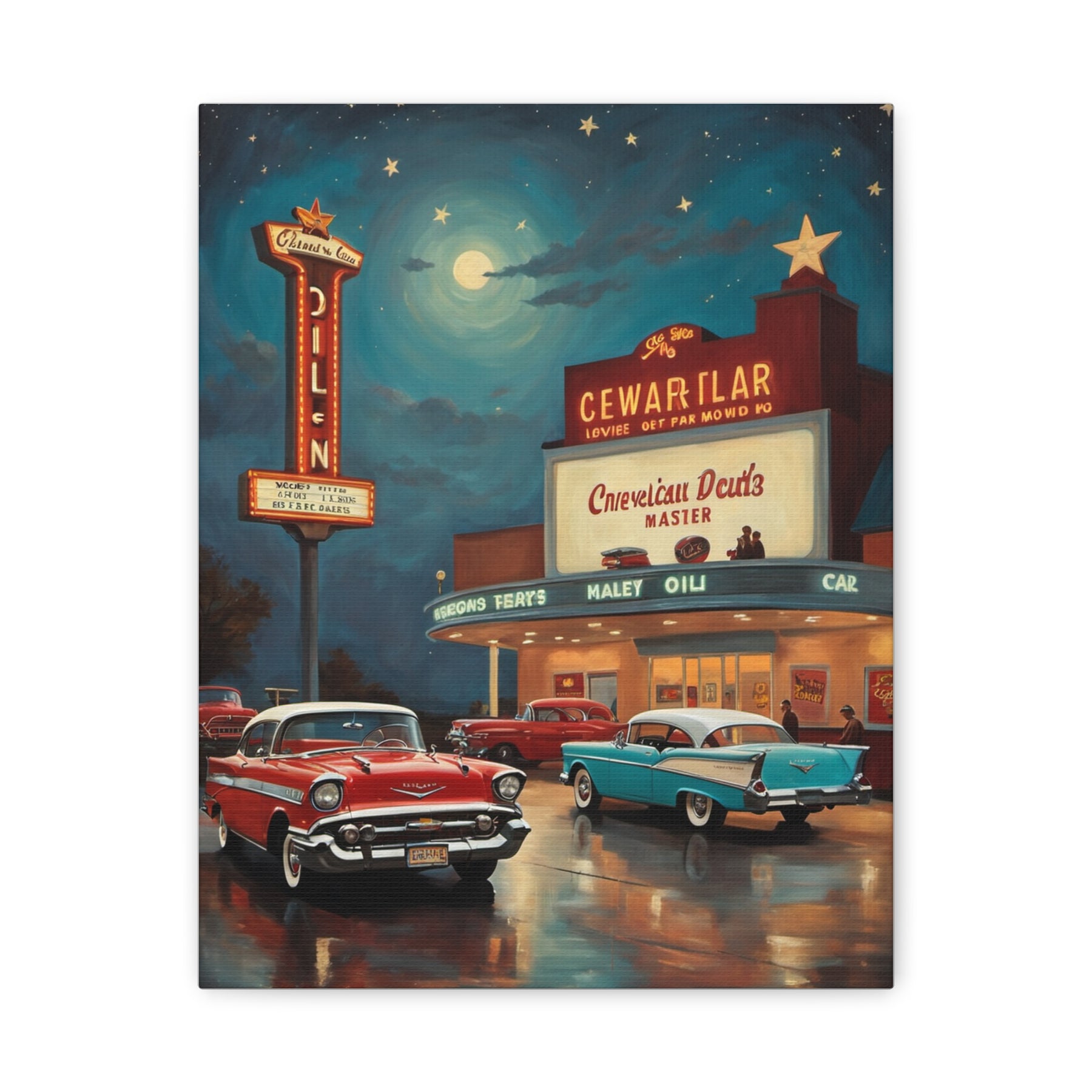 Retro movie theater canvas print featuring classic cars and a vintage cinema under a starry night