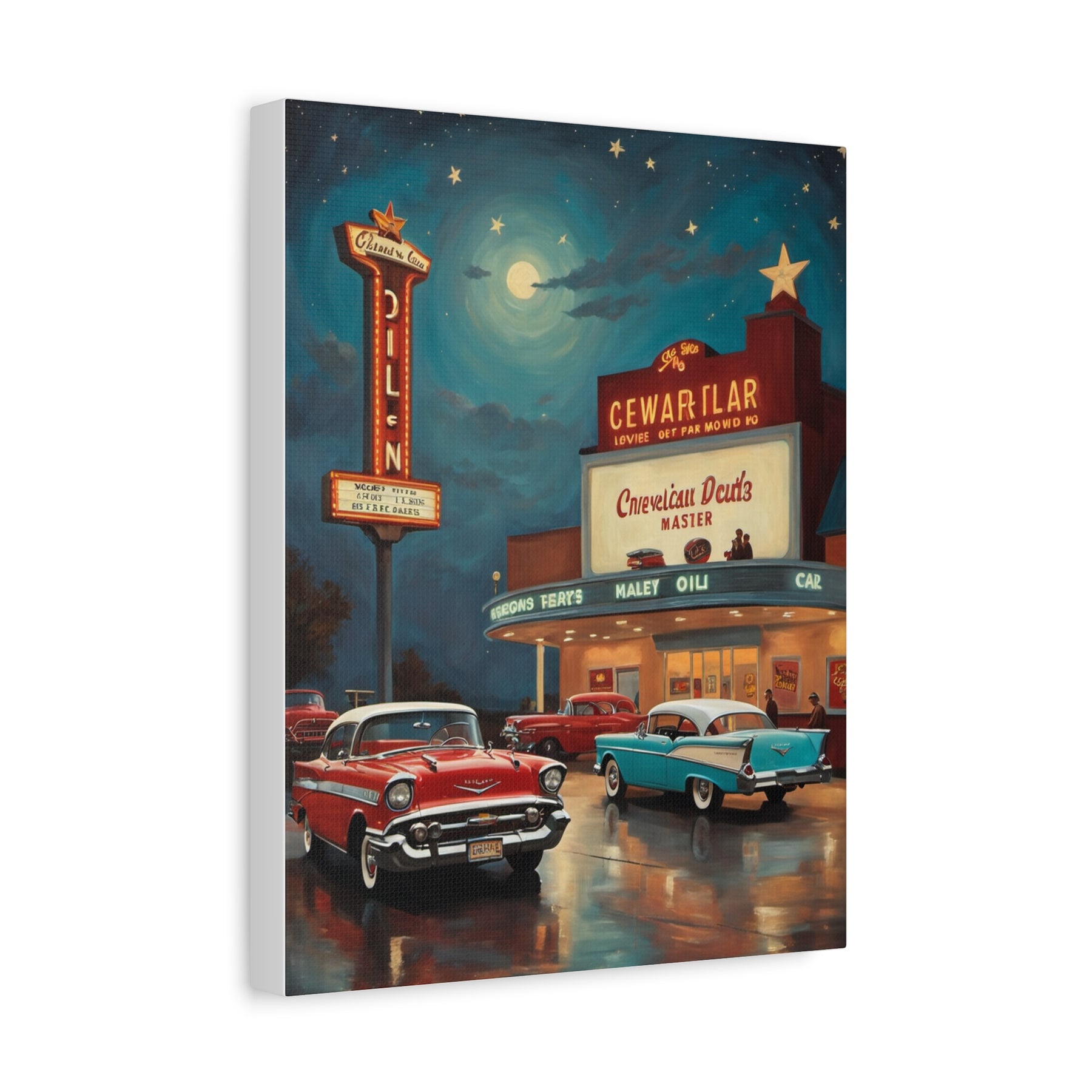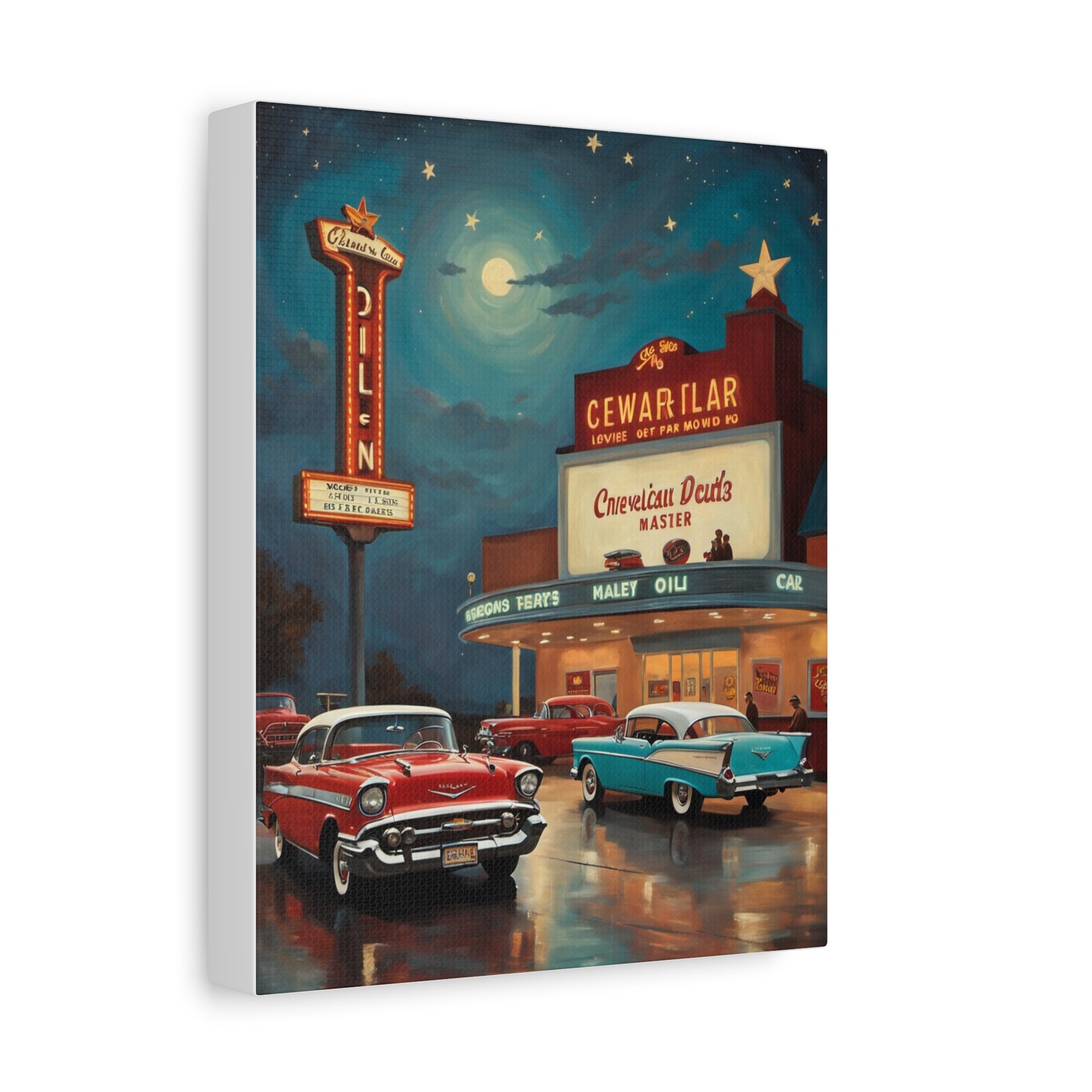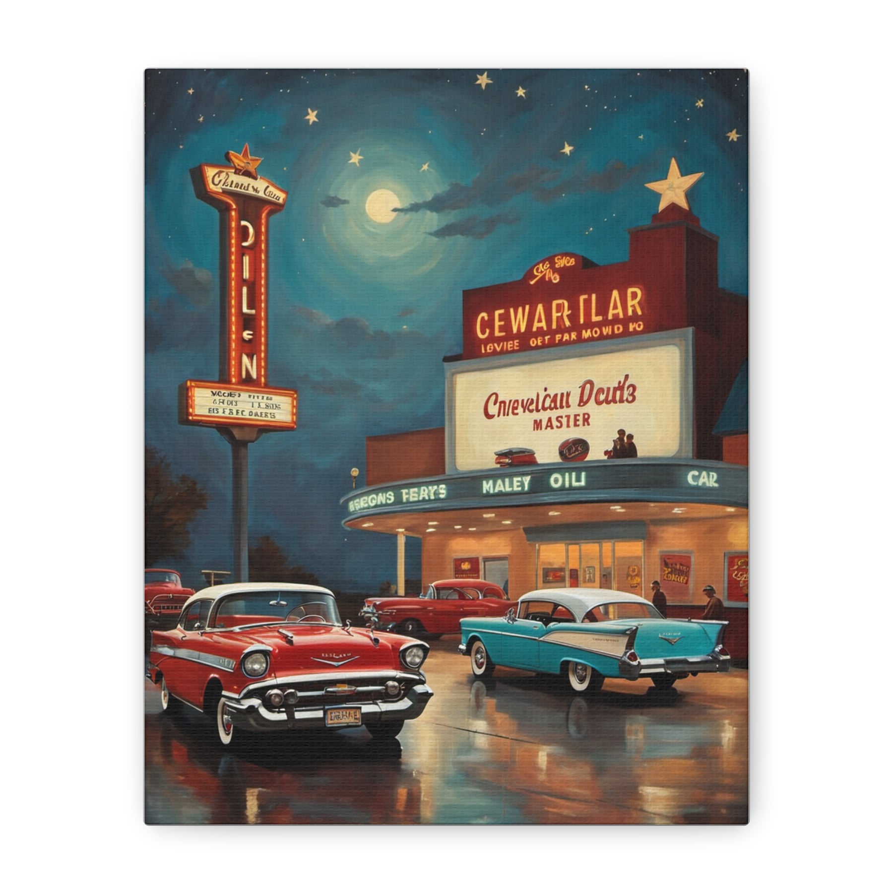 Retro movie theater canvas print featuring classic cars and a vintage cinema under a starry night