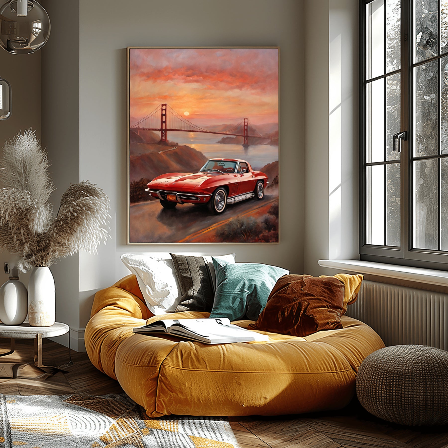 AquilVision digital sunset bridge oil painting of red classic car by Golden Gate in living room