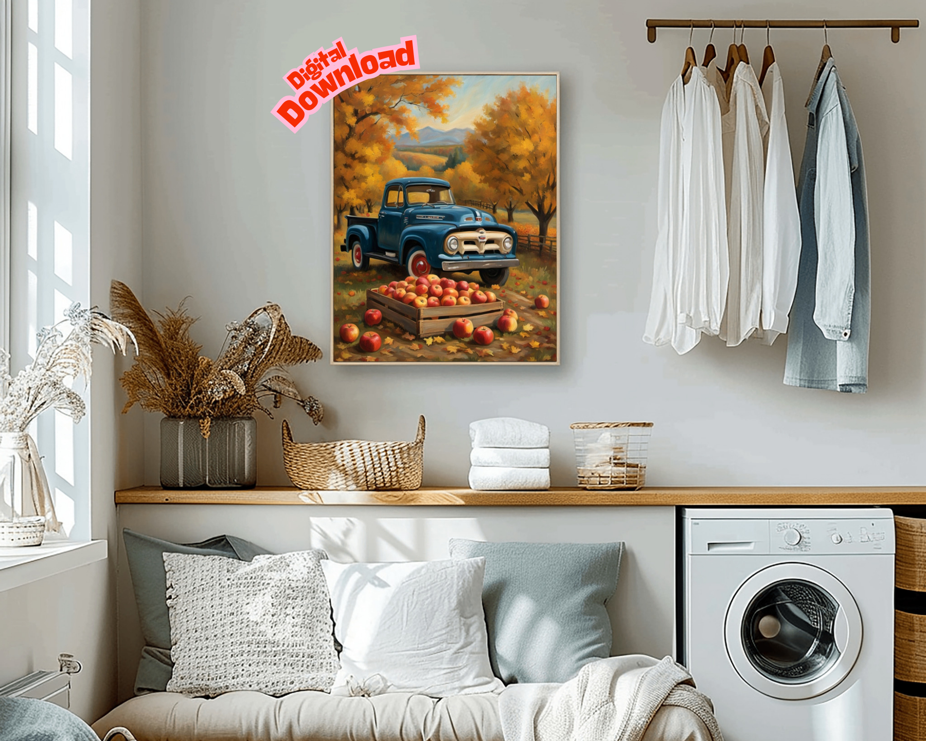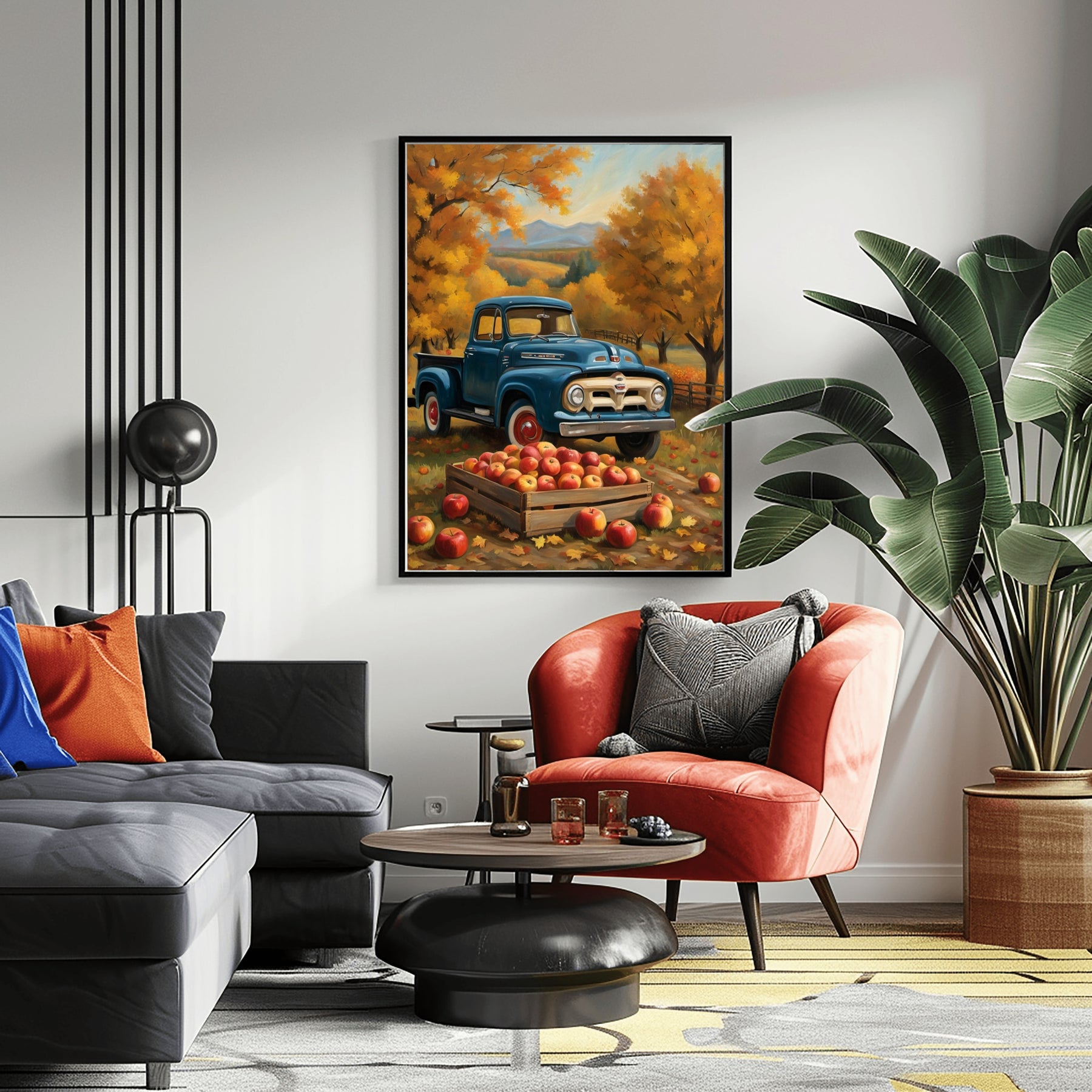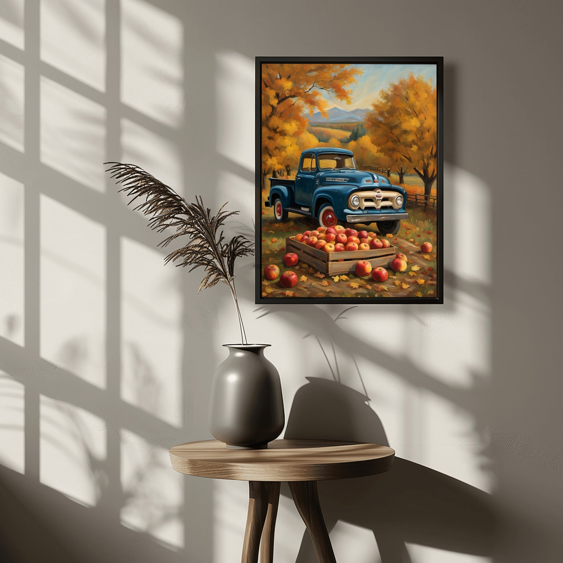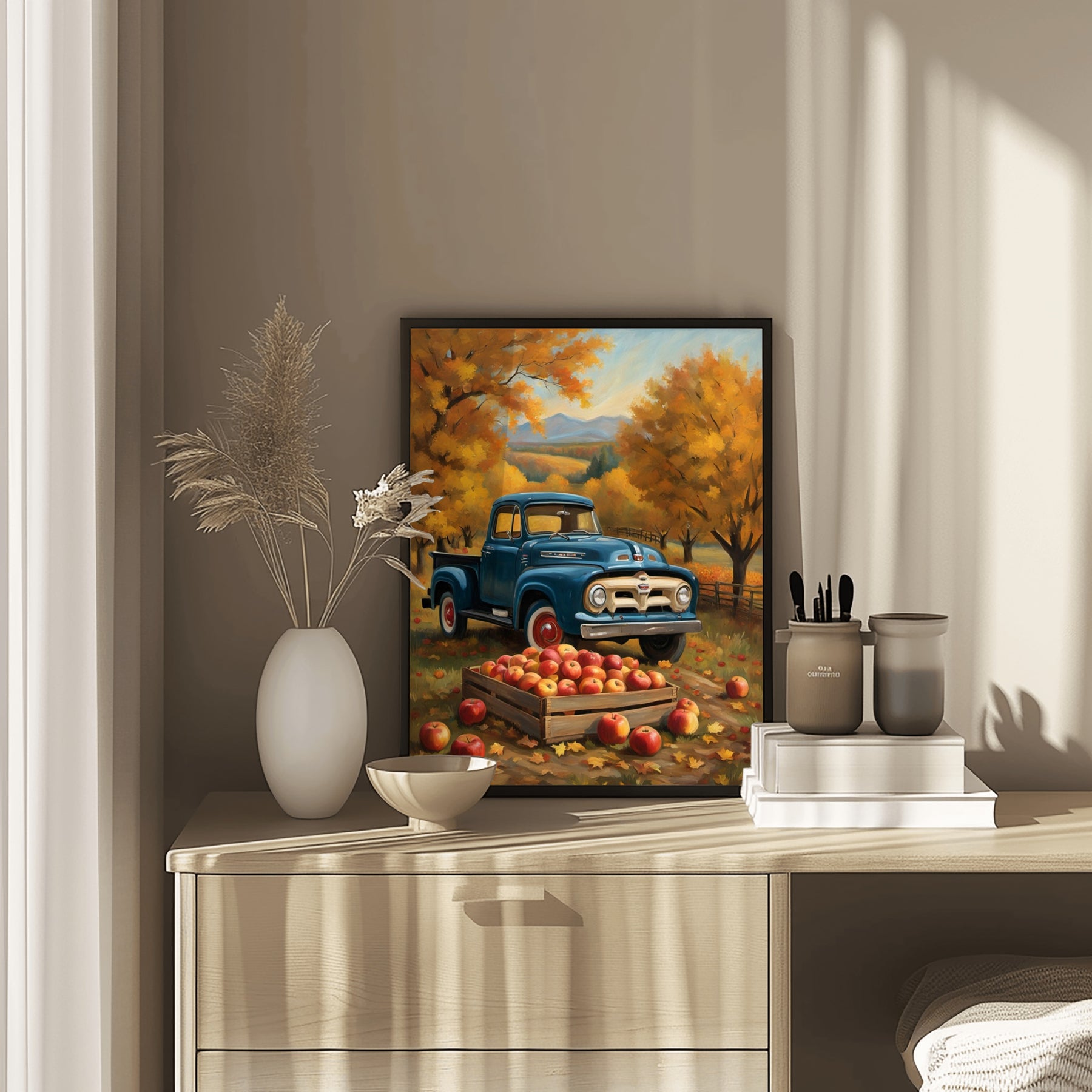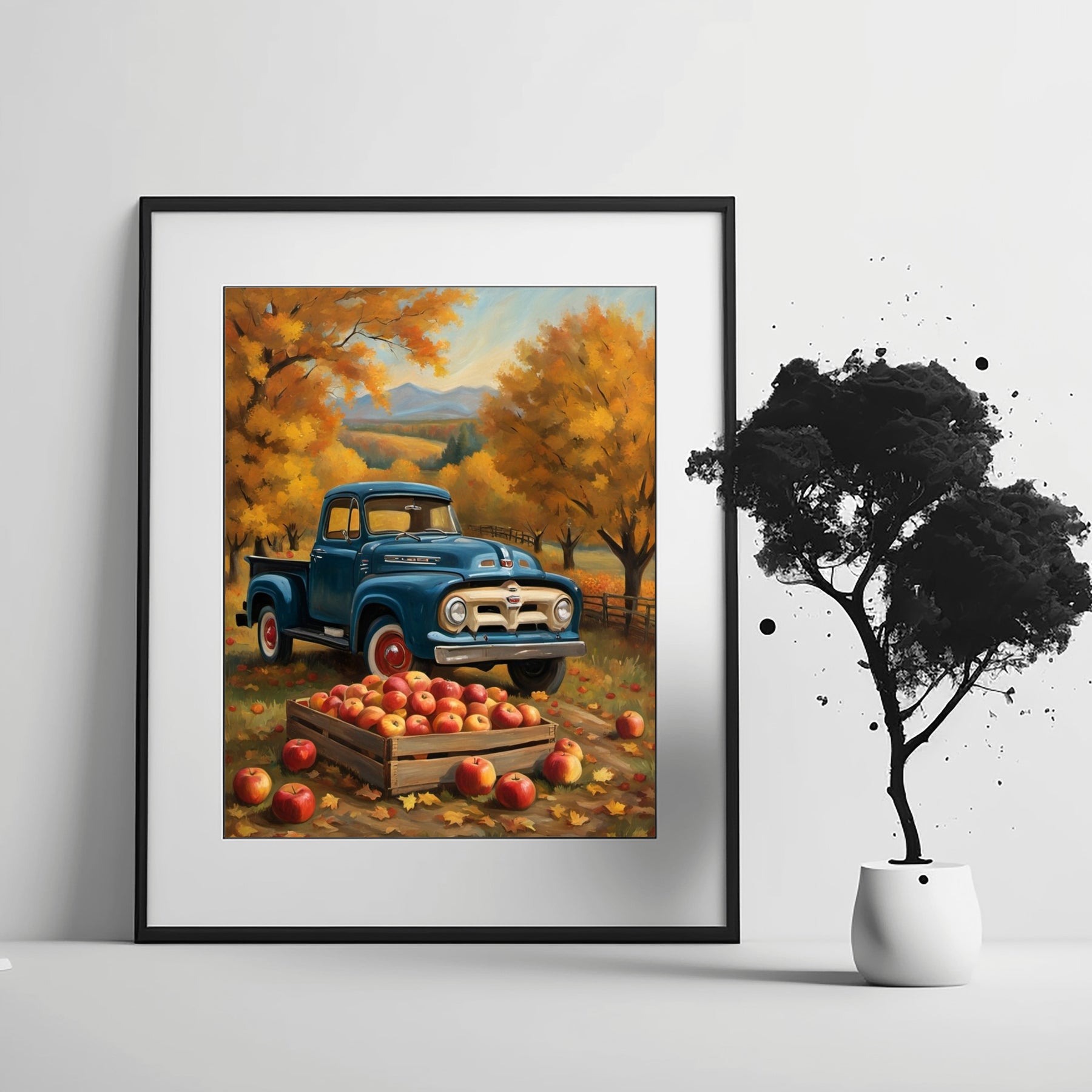 Family and friends will notice the vintage pickup and autumn orchard harvest painting. The realistic colors and careful brushwork make this painting unique. Display it on canvas, frame it, or hang it as is. The digital format offers flexibility for your needs.