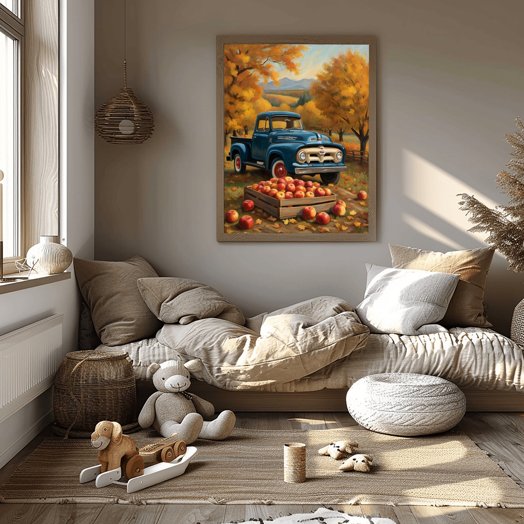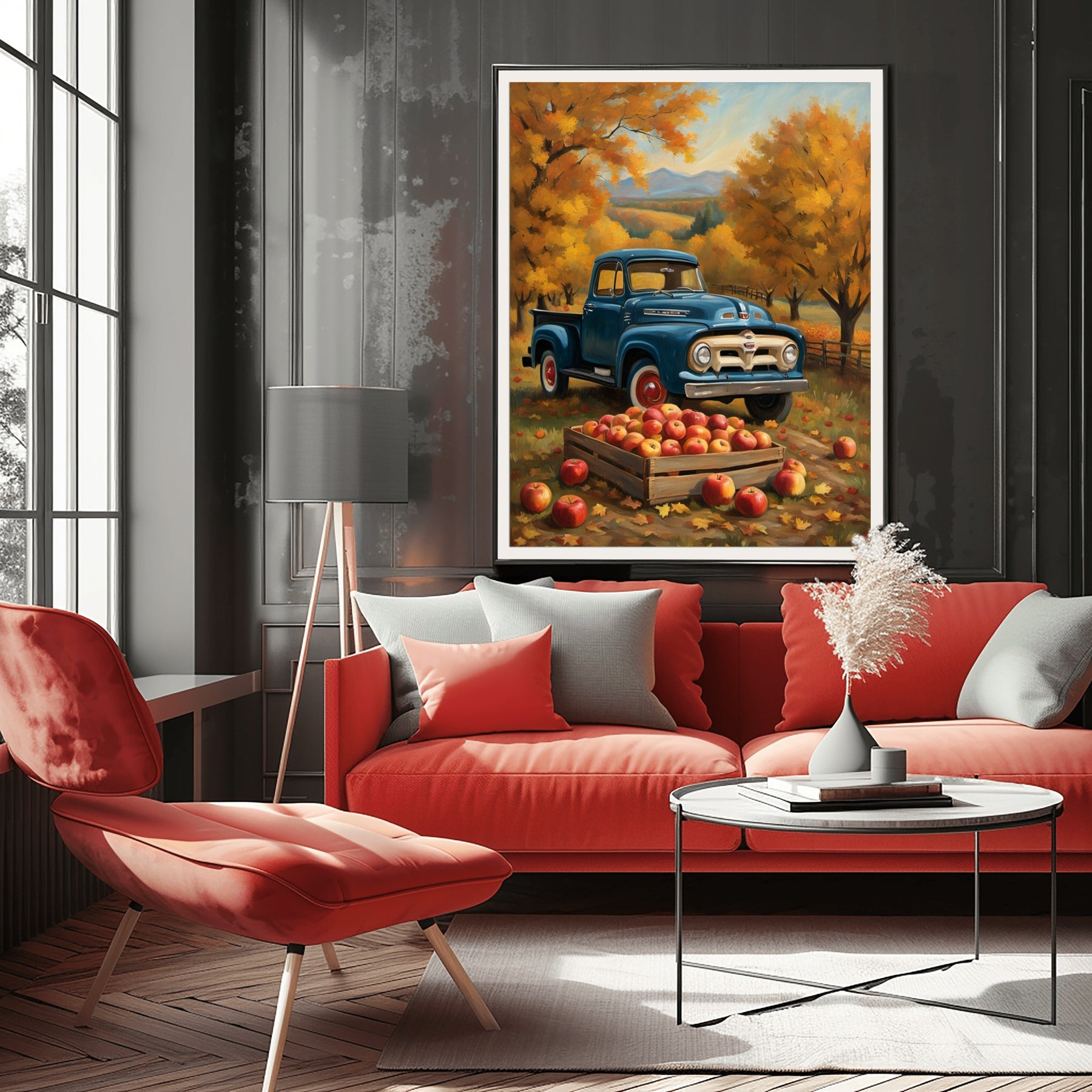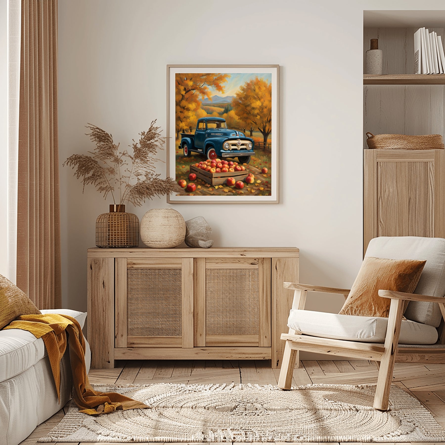 Warm orange and gold trees fill the background. There are apples overflowing from the pickup’s bed. This autumn orchard harvest painting celebrates rural life and the tradition of apple picking. It fits perfectly in a kitchen, living room, or entryway. The artwork makes your home feel inviting and relaxed.
