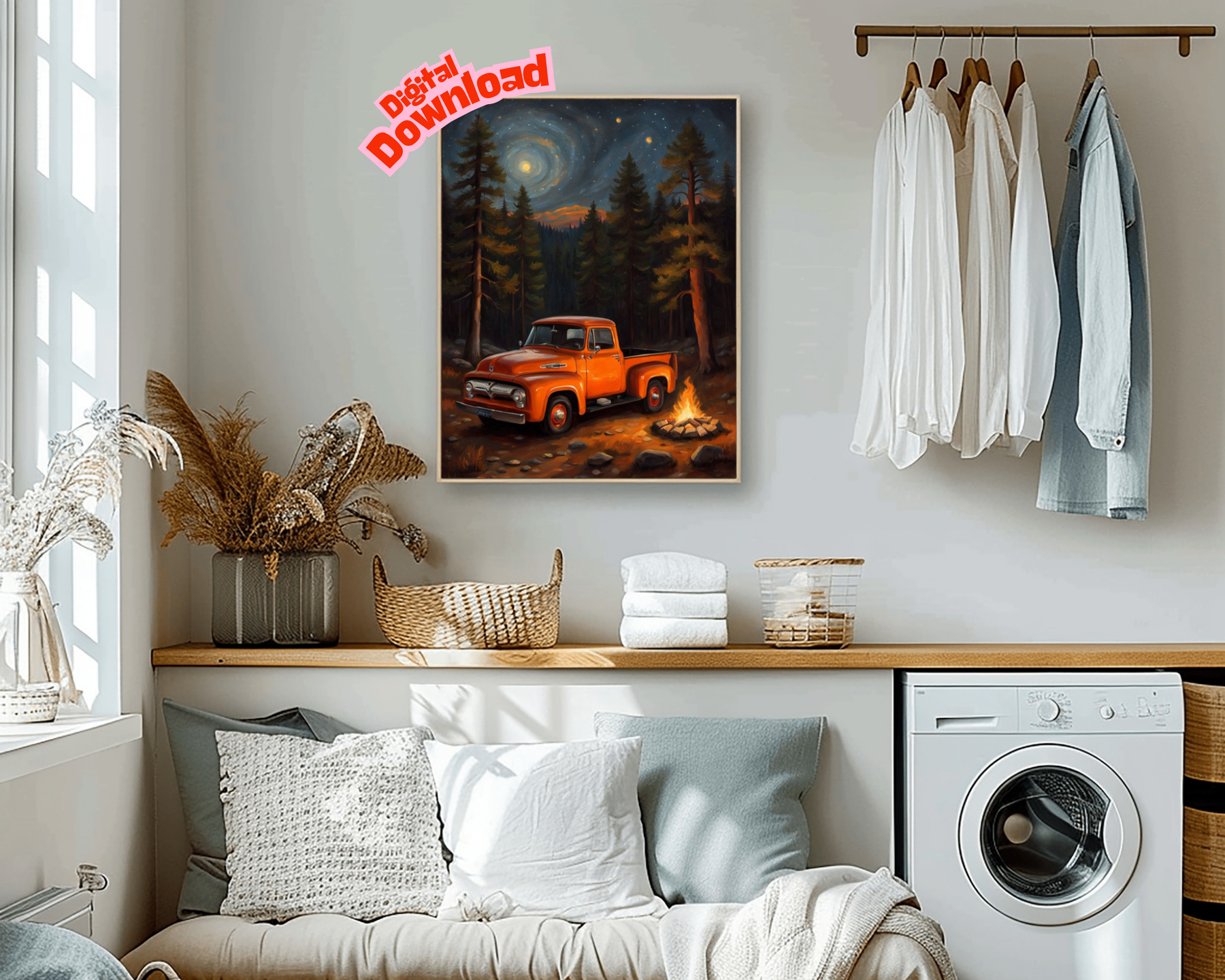 This glowing campfire forest artwork offers a perfect balance of rustic charm and peaceful vibes. The digital oil painting captures every detail, from the truck's classic curves to the subtle play of firelight against the bark and leaves. The soft glow from the campfire brings the whole piece to life, filling your space with a sense of calm and wonder.
