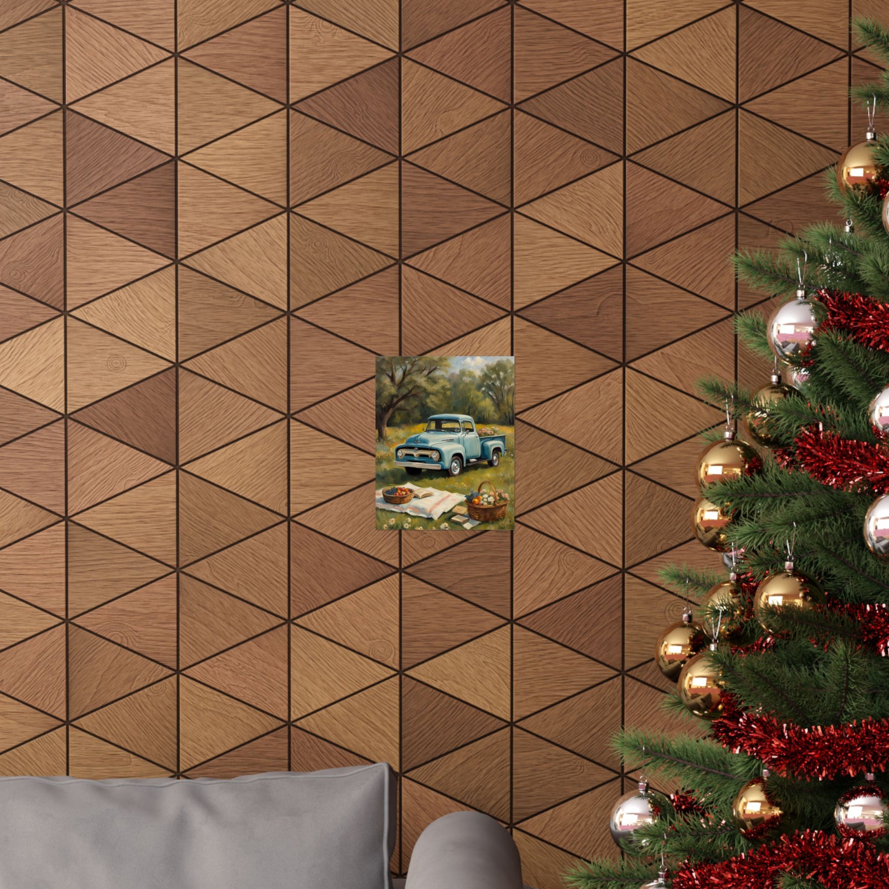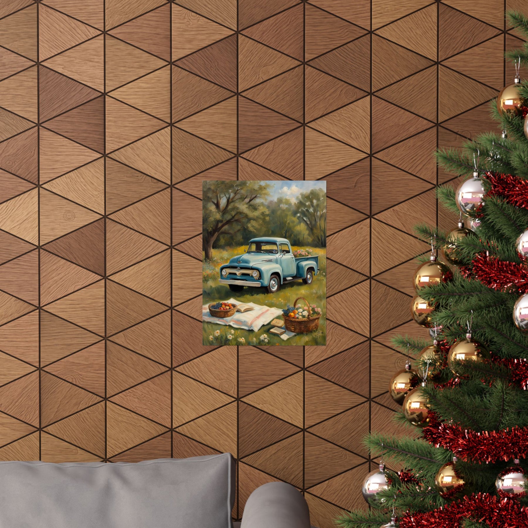 Rustic Farmhouse Poster featuring a vintage truck among greenery and picnic items on a cozy wall
