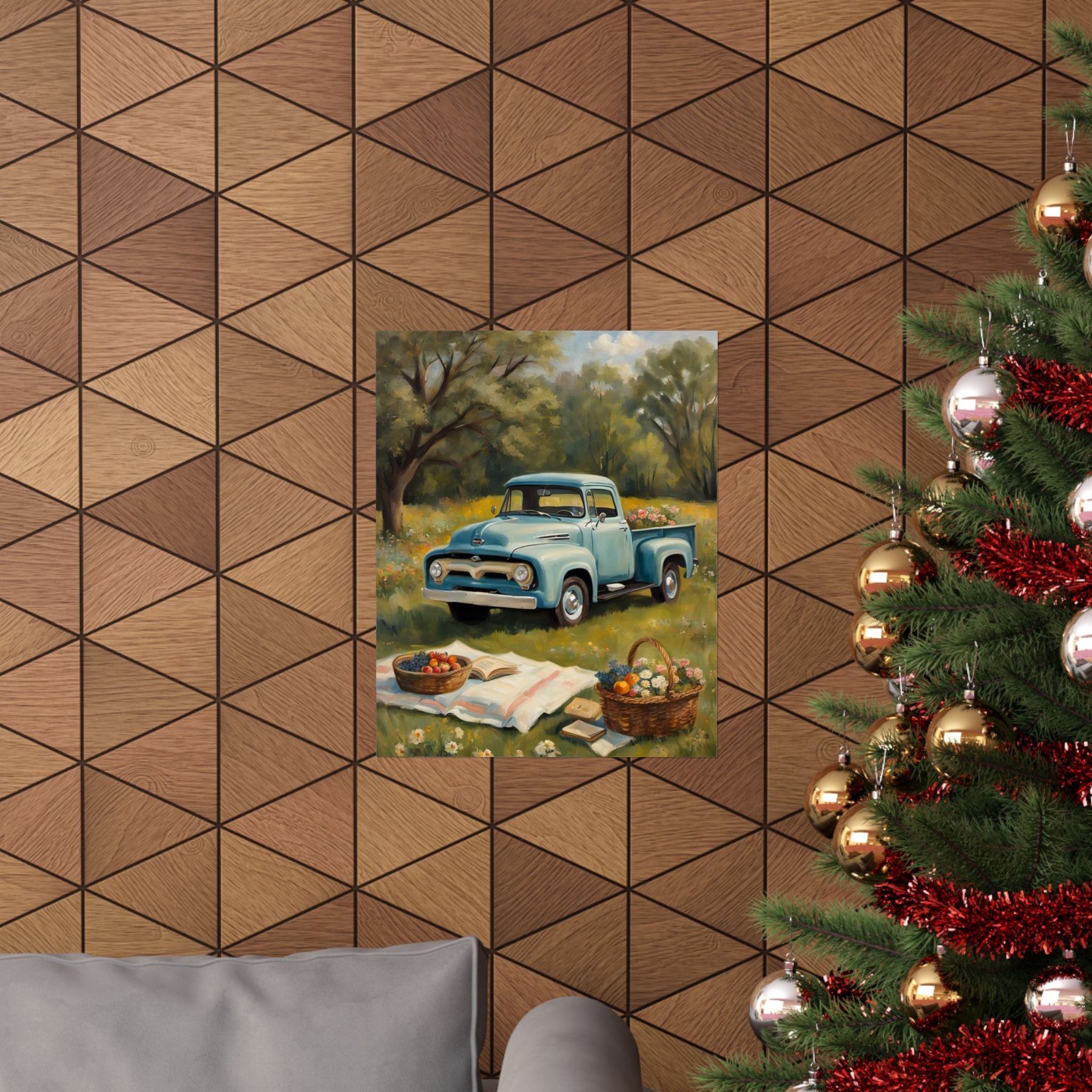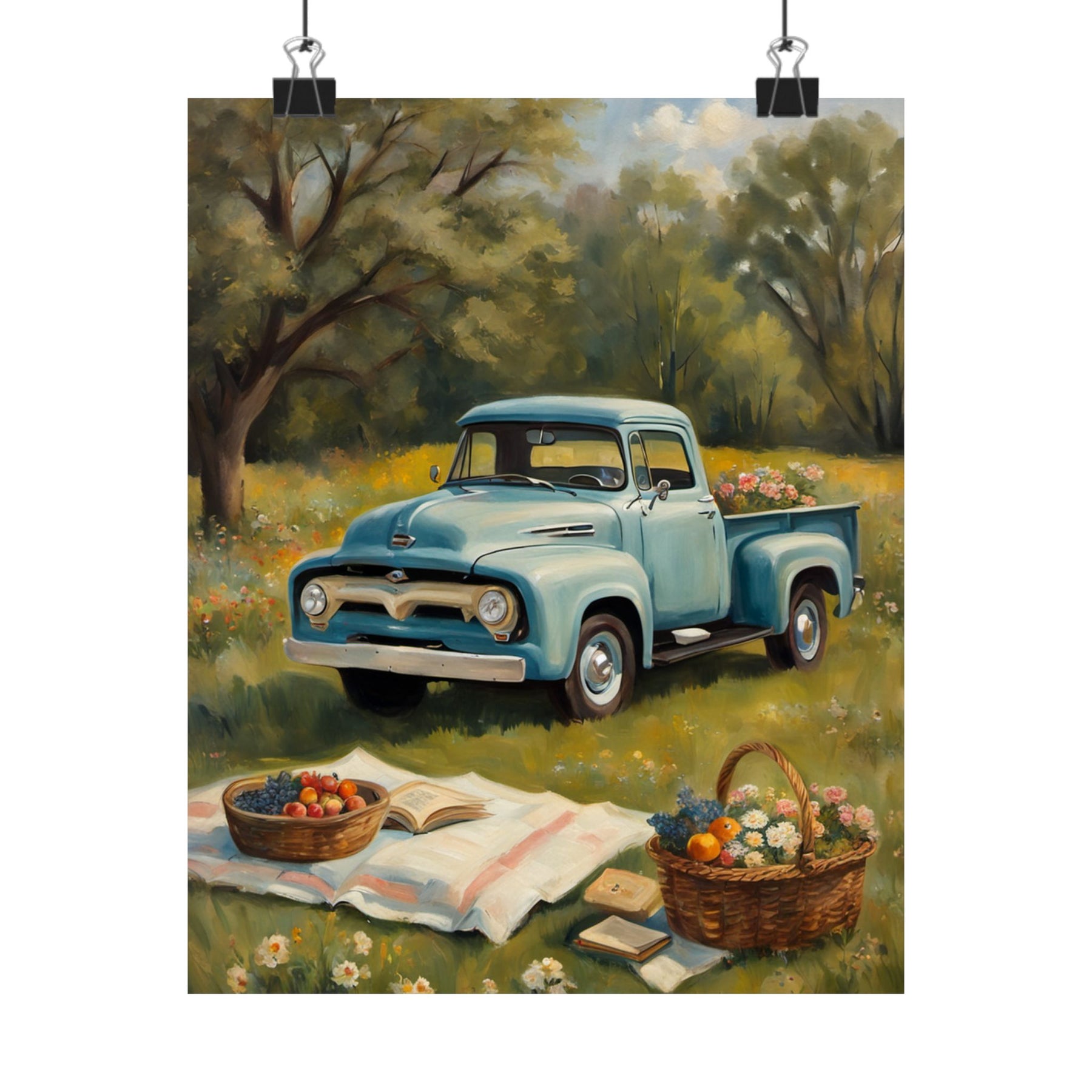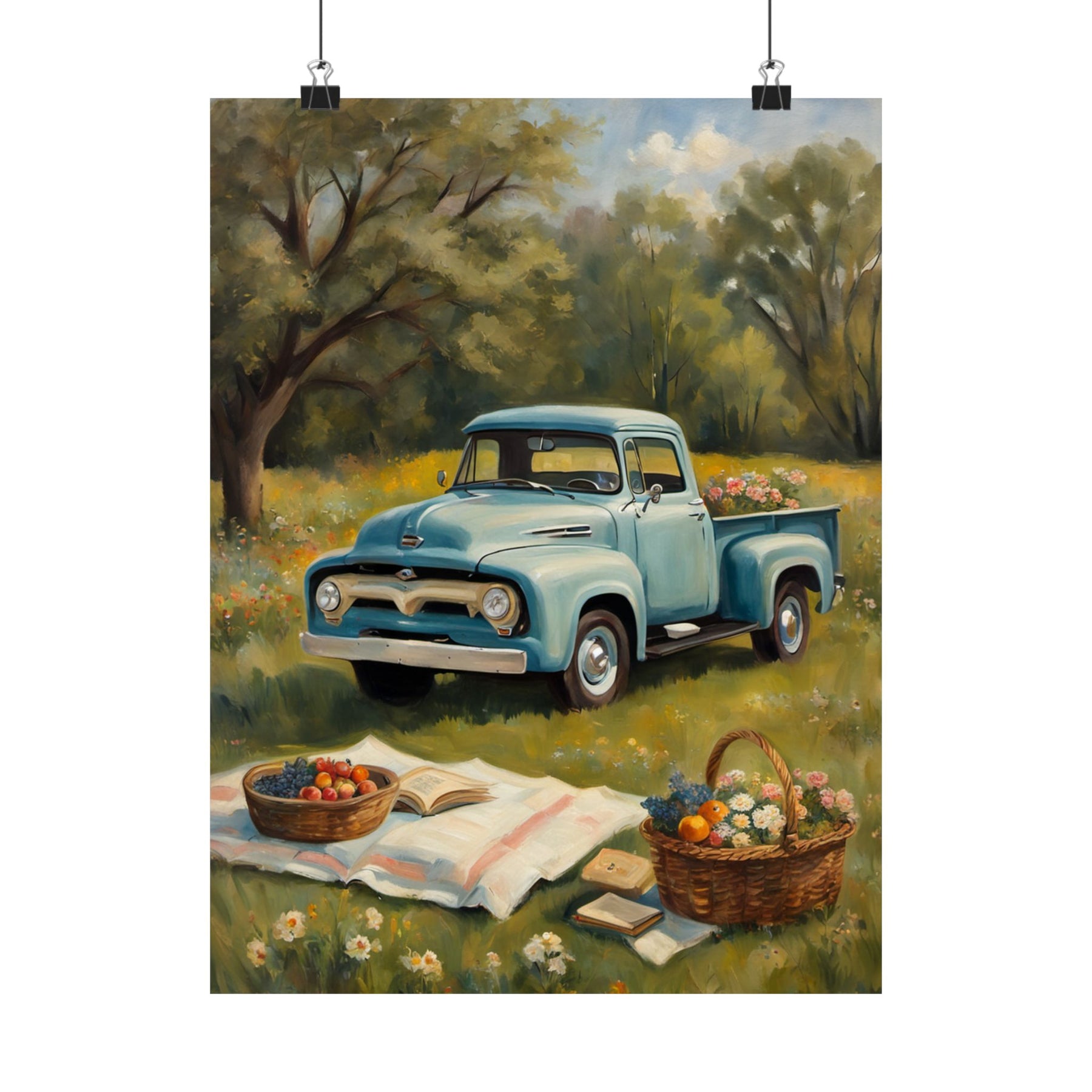 Rustic Farmhouse Poster featuring a vintage blue truck in a scenic meadow with picnic baskets