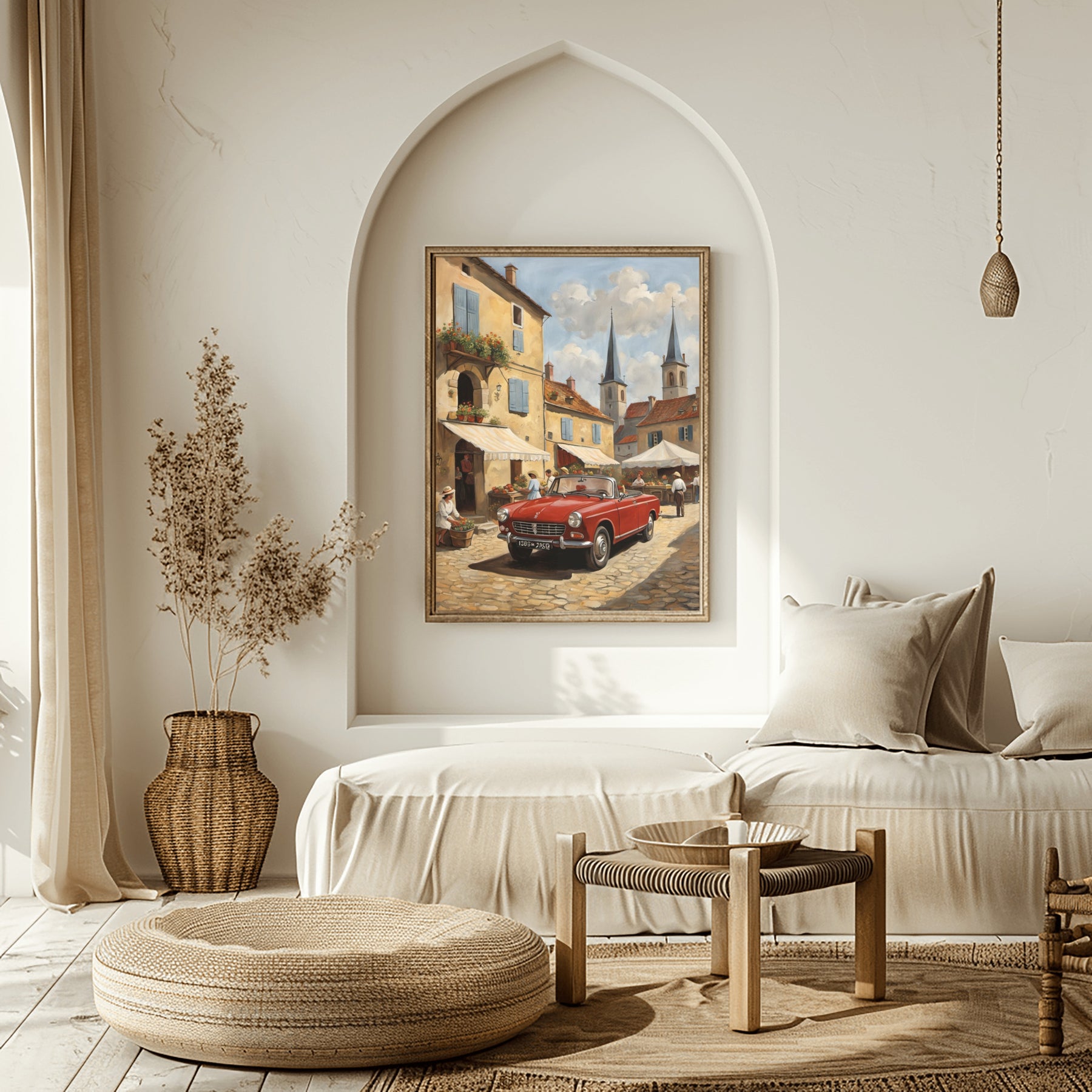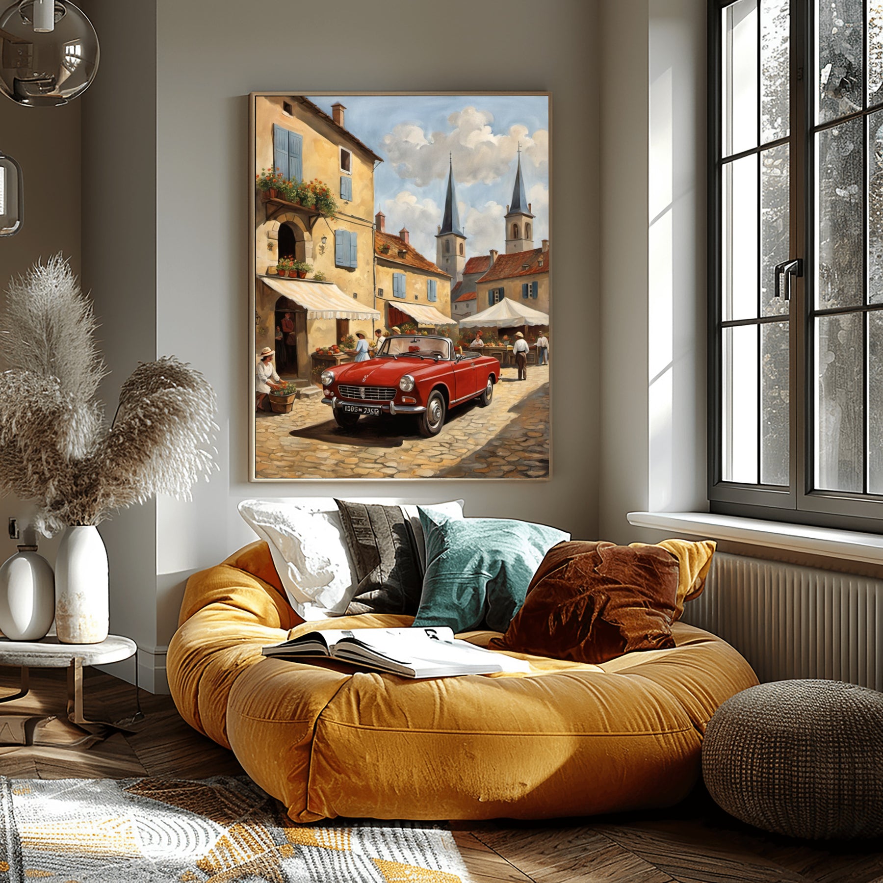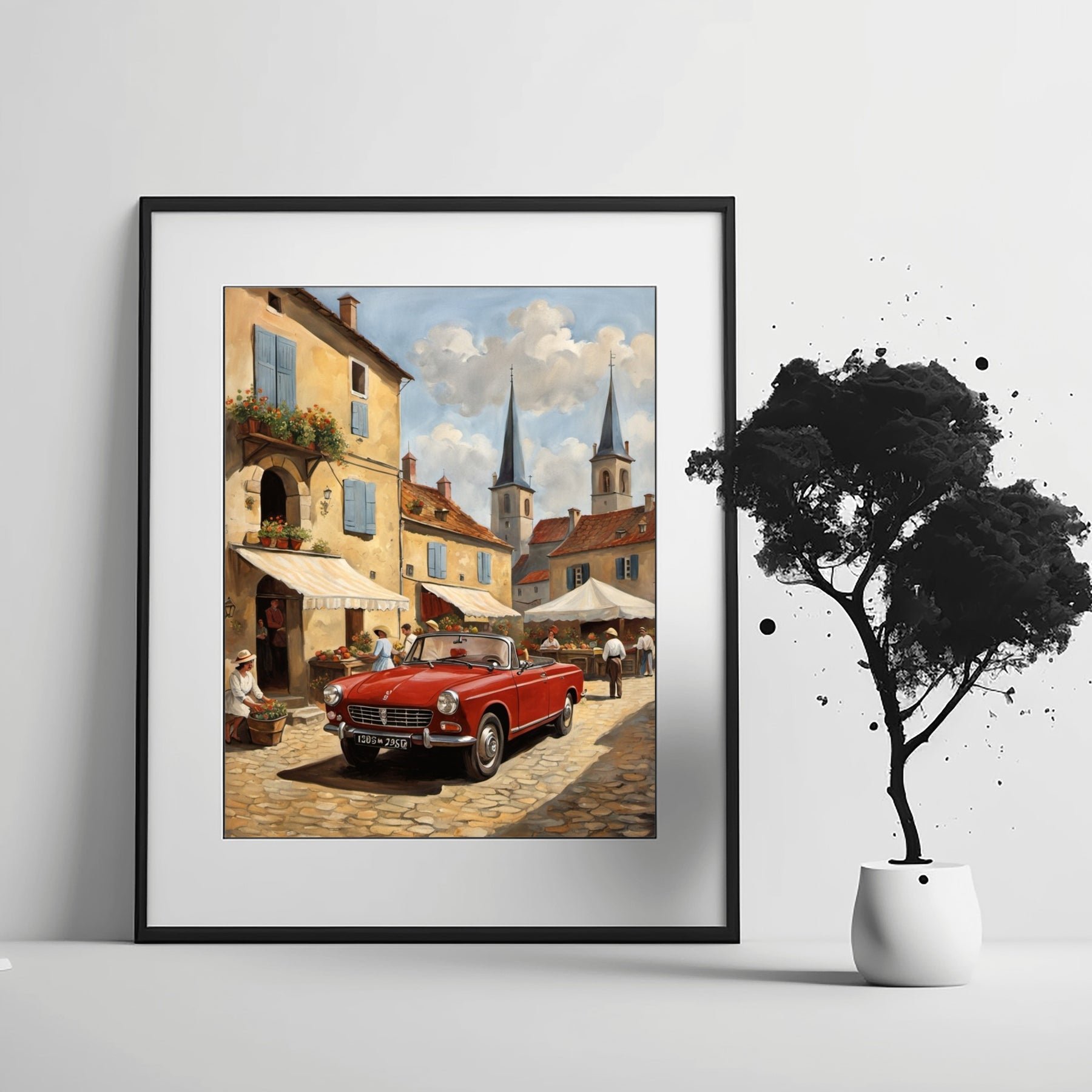 Two church spires rise beyond the village rooftops. A bright red classic car anchors the foreground, setting a scene both lively and timeless. The details in this bustling market scene painting transport you to a joyful morning in a French countryside town. Each figure and shadow enhances the sense of movement.