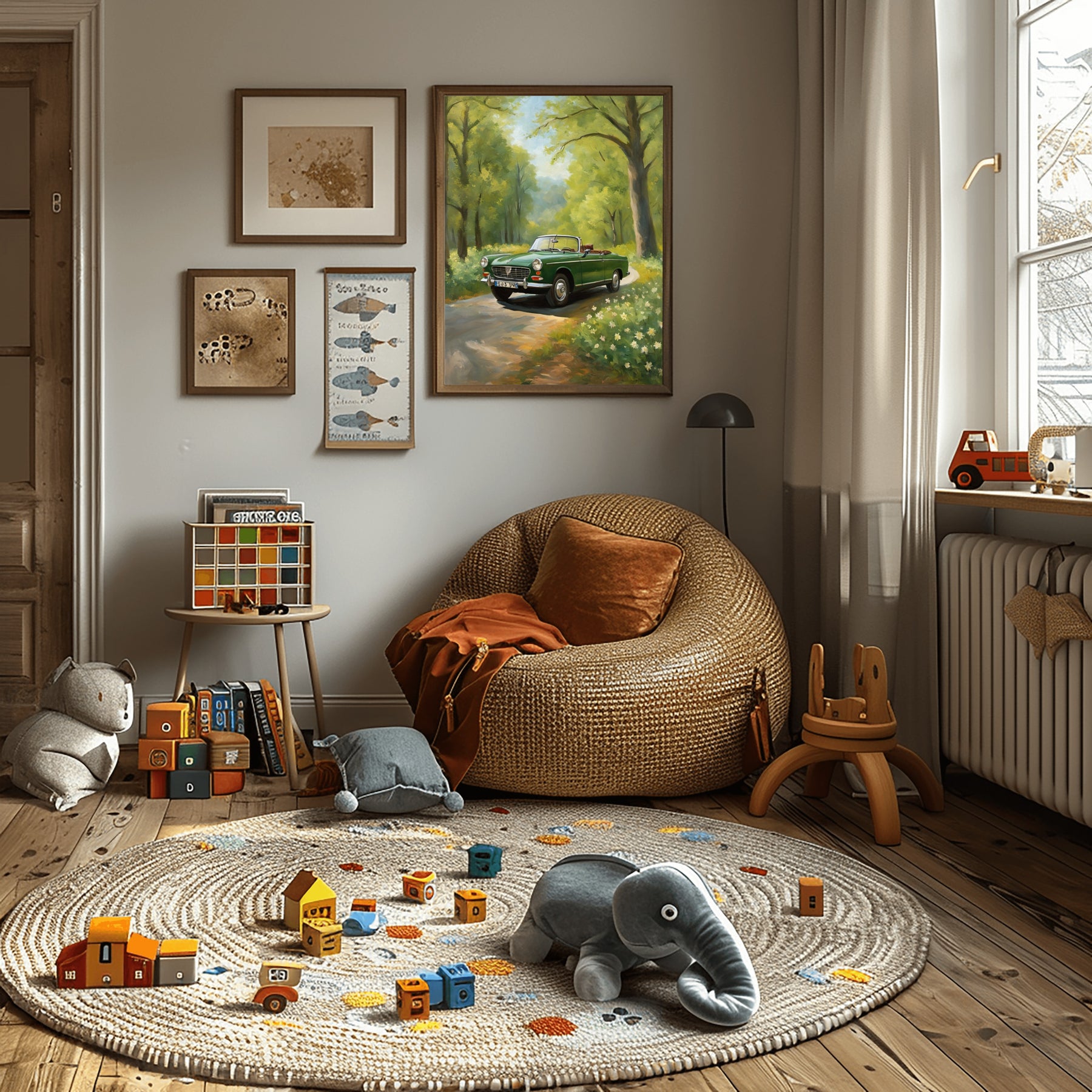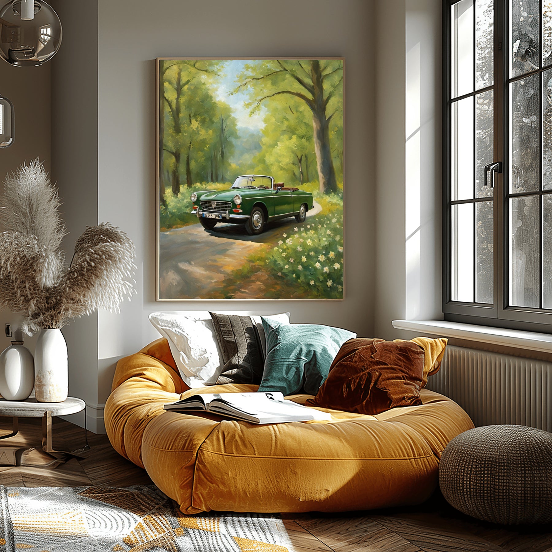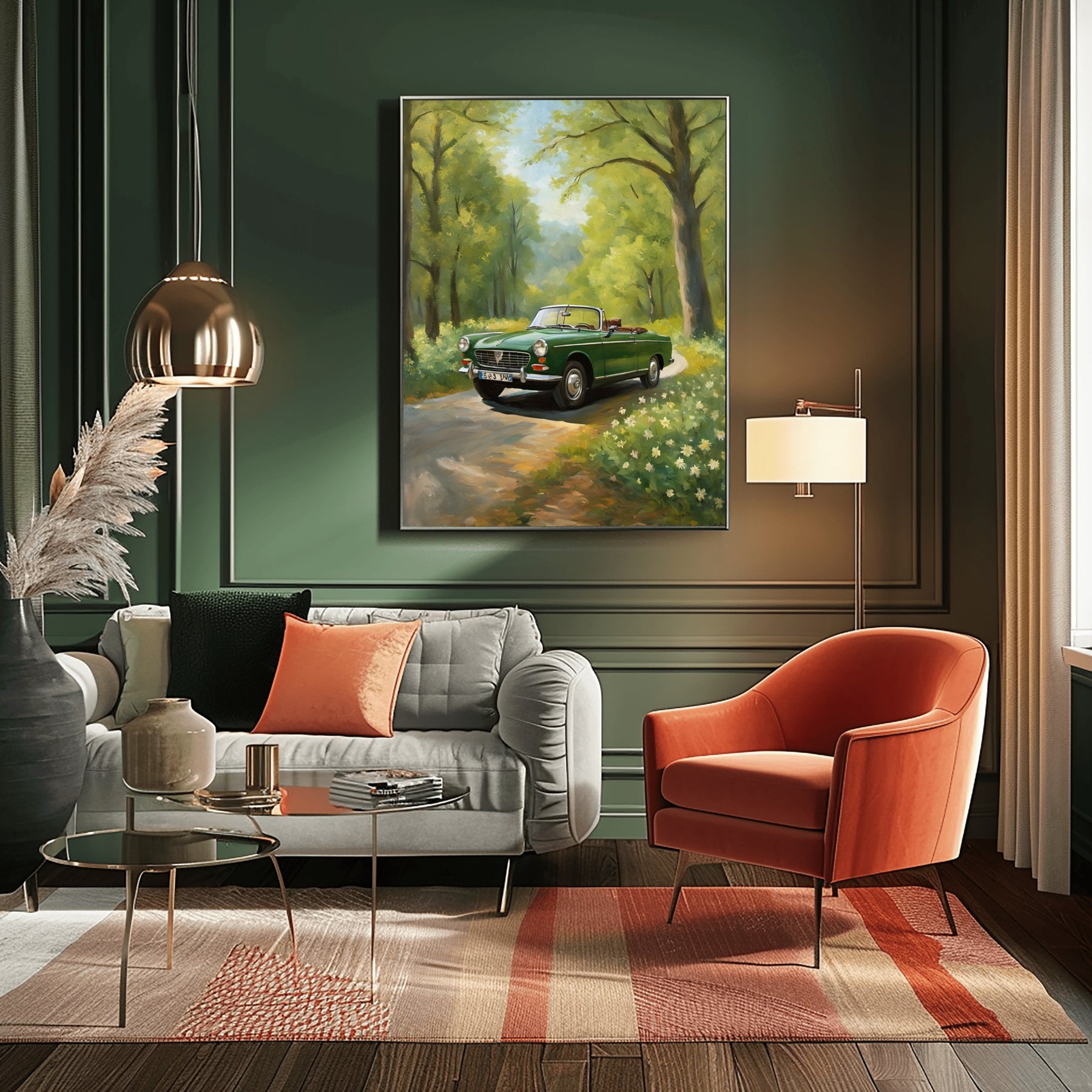 Ideal for art lovers, collectors, and anyone who enjoys peaceful landscapes. The green vintage car art print fits many decor styles. It stands out and attracts attention right away. Place it above a sofa or add it to a gallery wall.