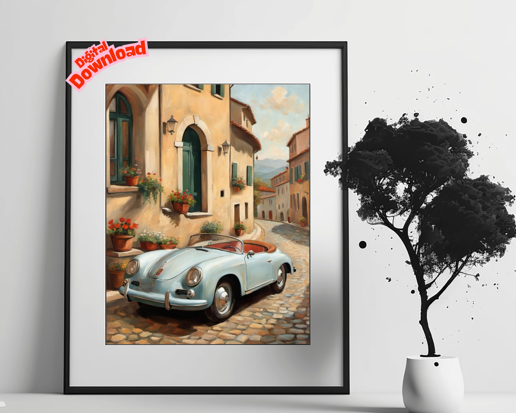 Choose this Italian village car painting to add a sense of charm and history to any space. The combination of classic design and a peaceful setting provides restful beauty. Bring the allure of an Italian street and a vintage car into your home or workspace with a single digital download.