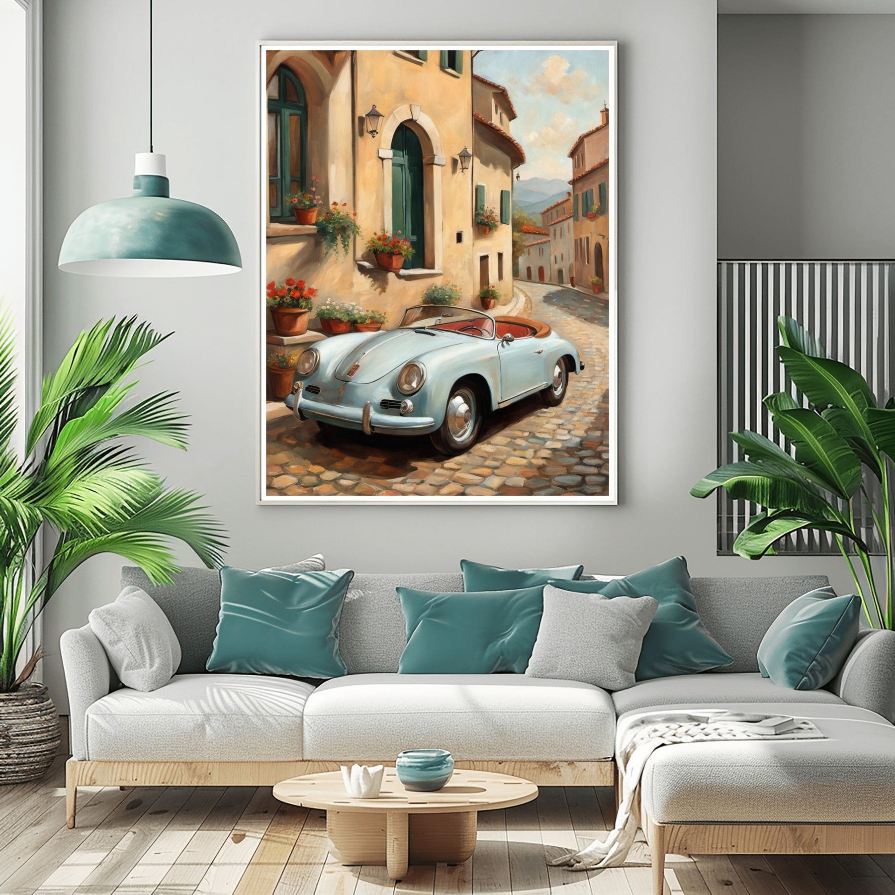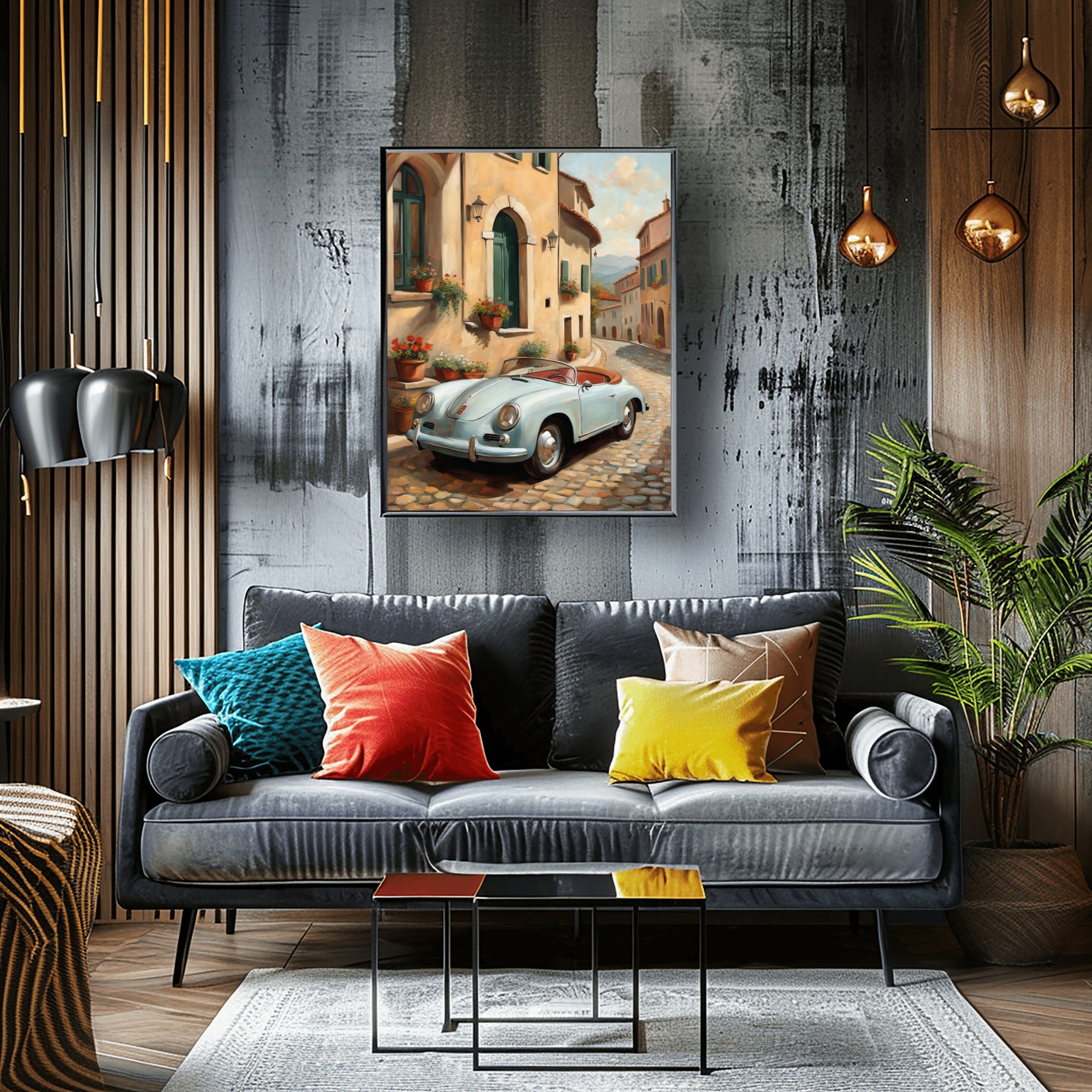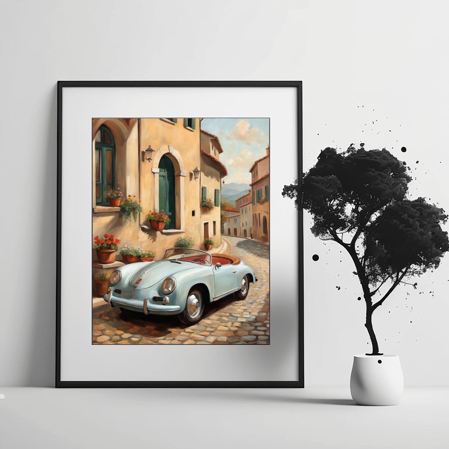 This Italian village car painting offers a unique look for any room. It shines as a statement piece that tells a story of adventure and style. The painting draws attention without overpowering. Place it above a sofa, in a home office, or within a hallway for an instant touch of elegance.