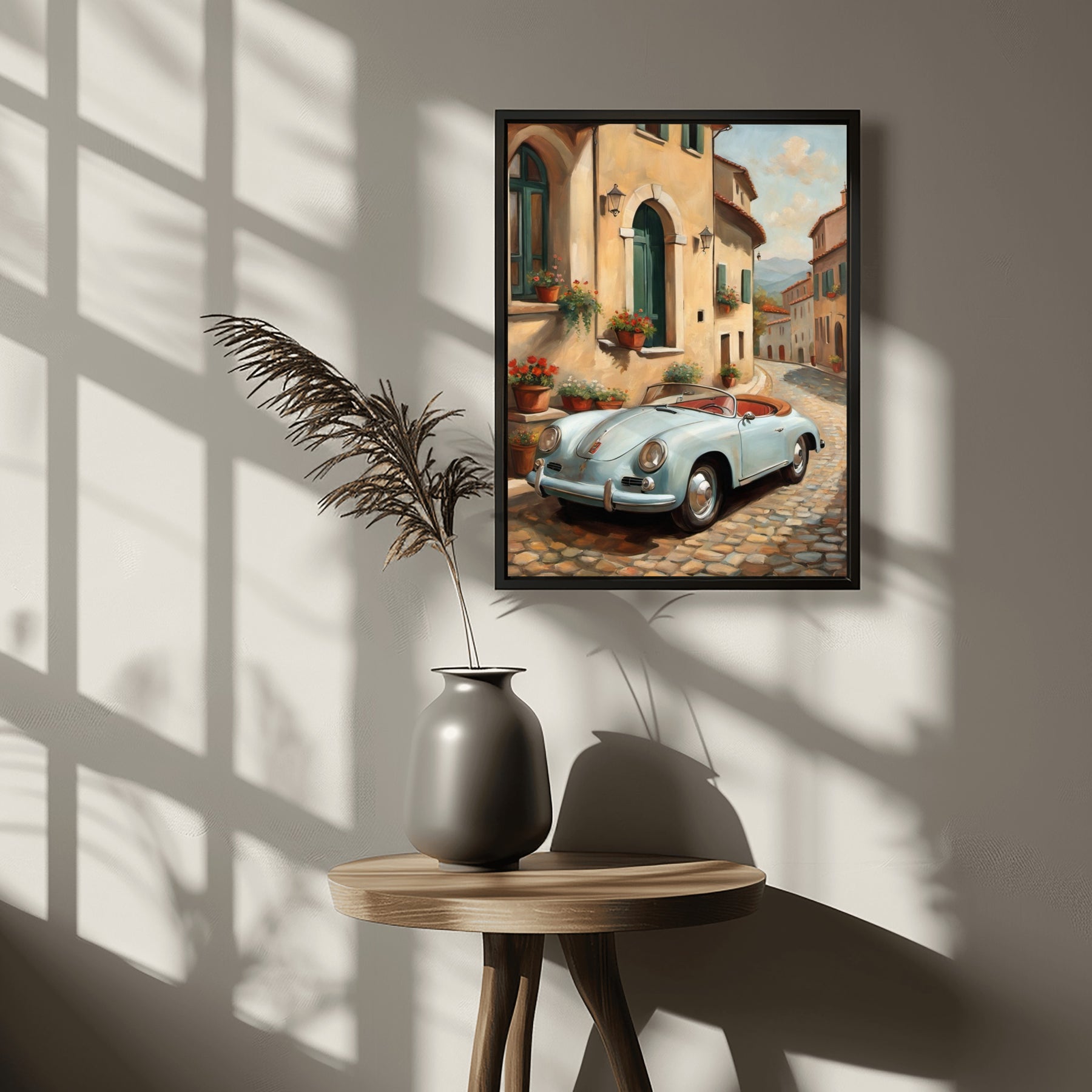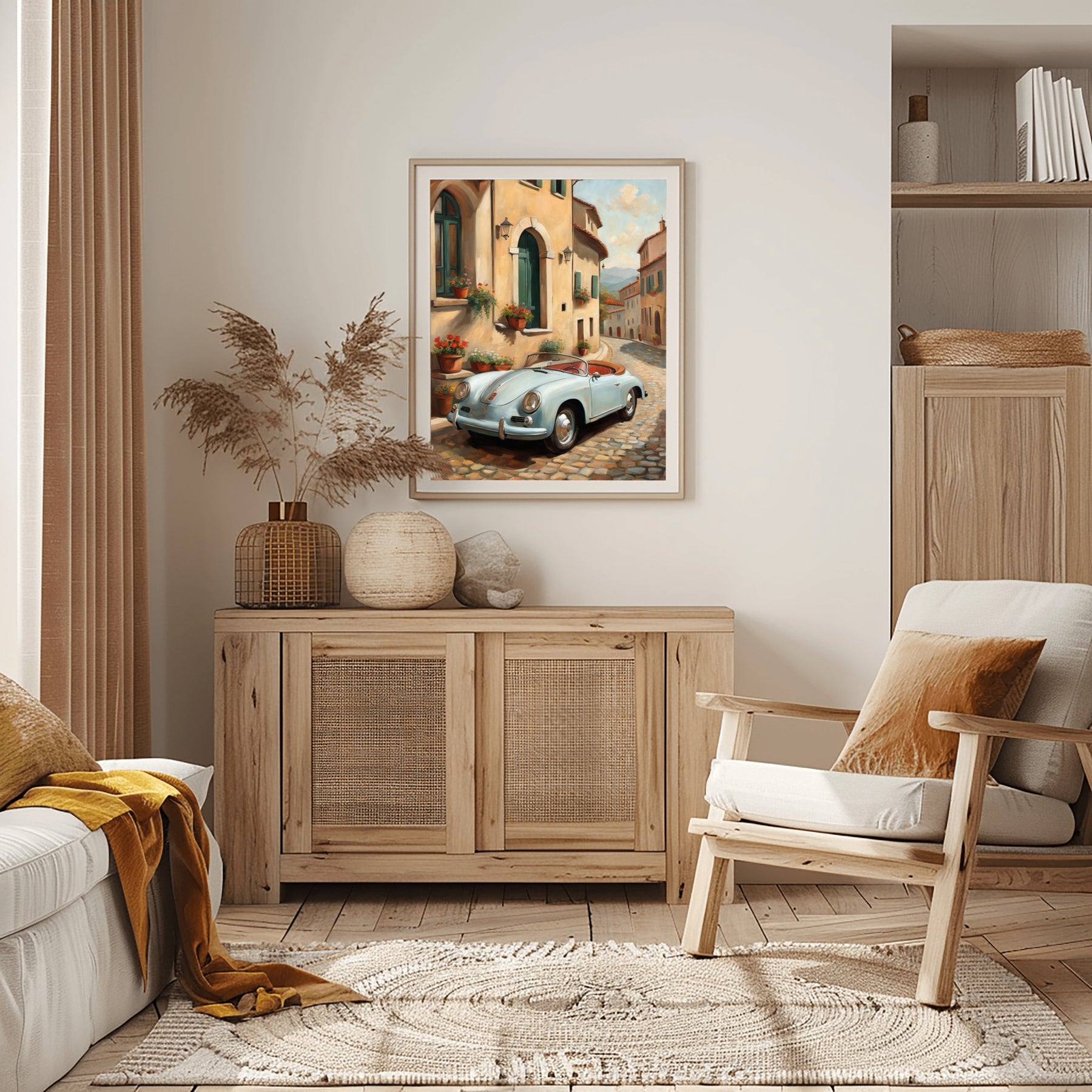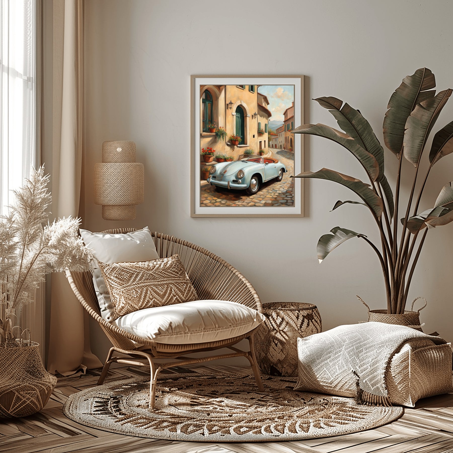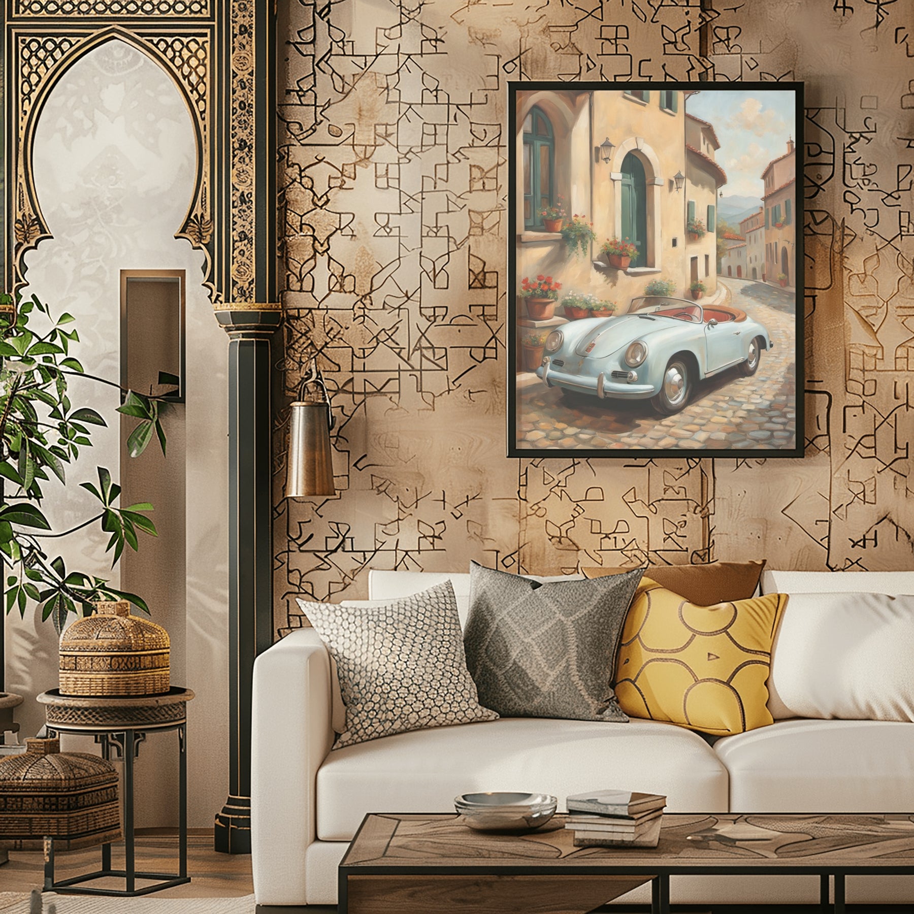 This Italian village car painting offers a unique look for any room. It shines as a statement piece that tells a story of adventure and style. The painting draws attention without overpowering. Place it above a sofa, in a home office, or within a hallway for an instant touch of elegance.