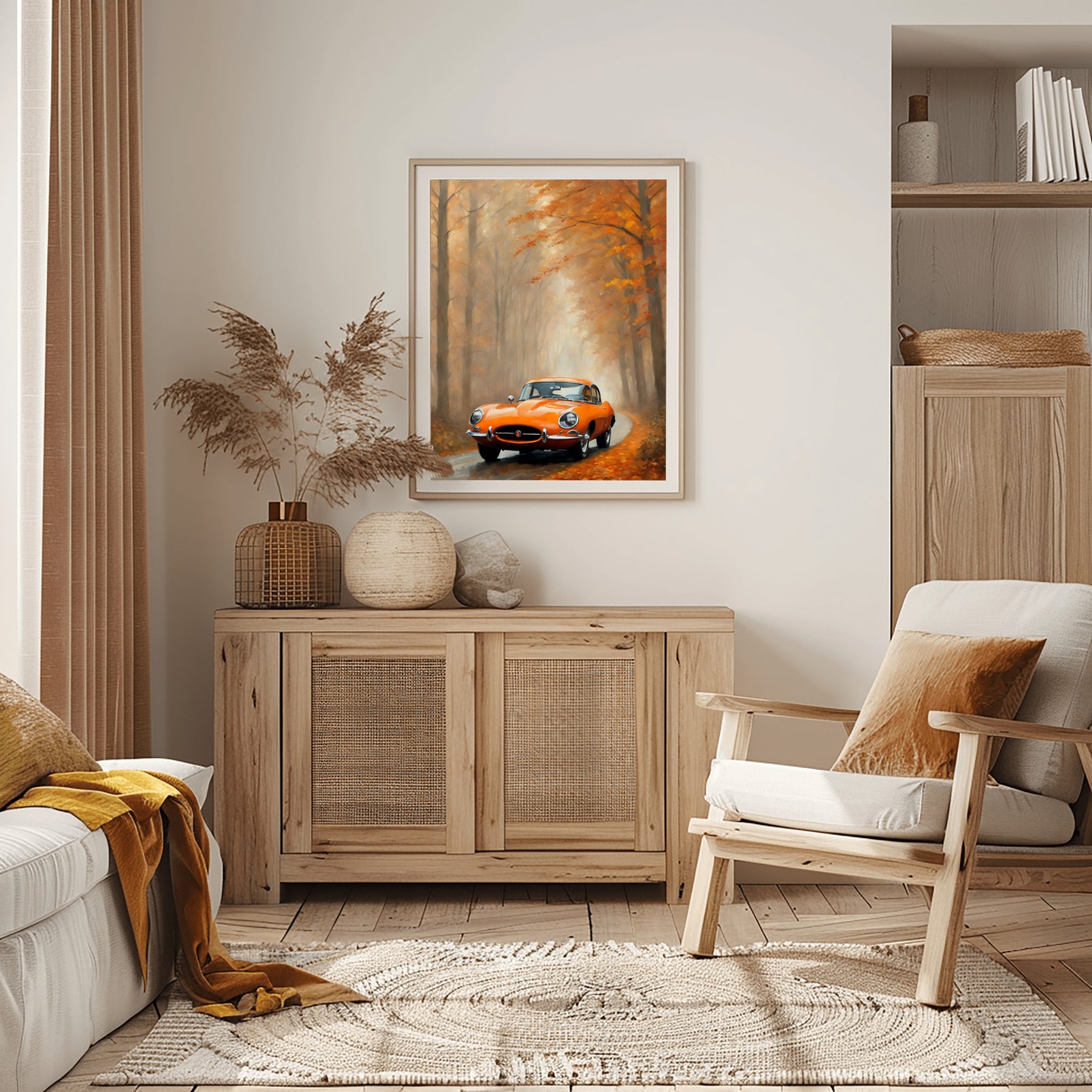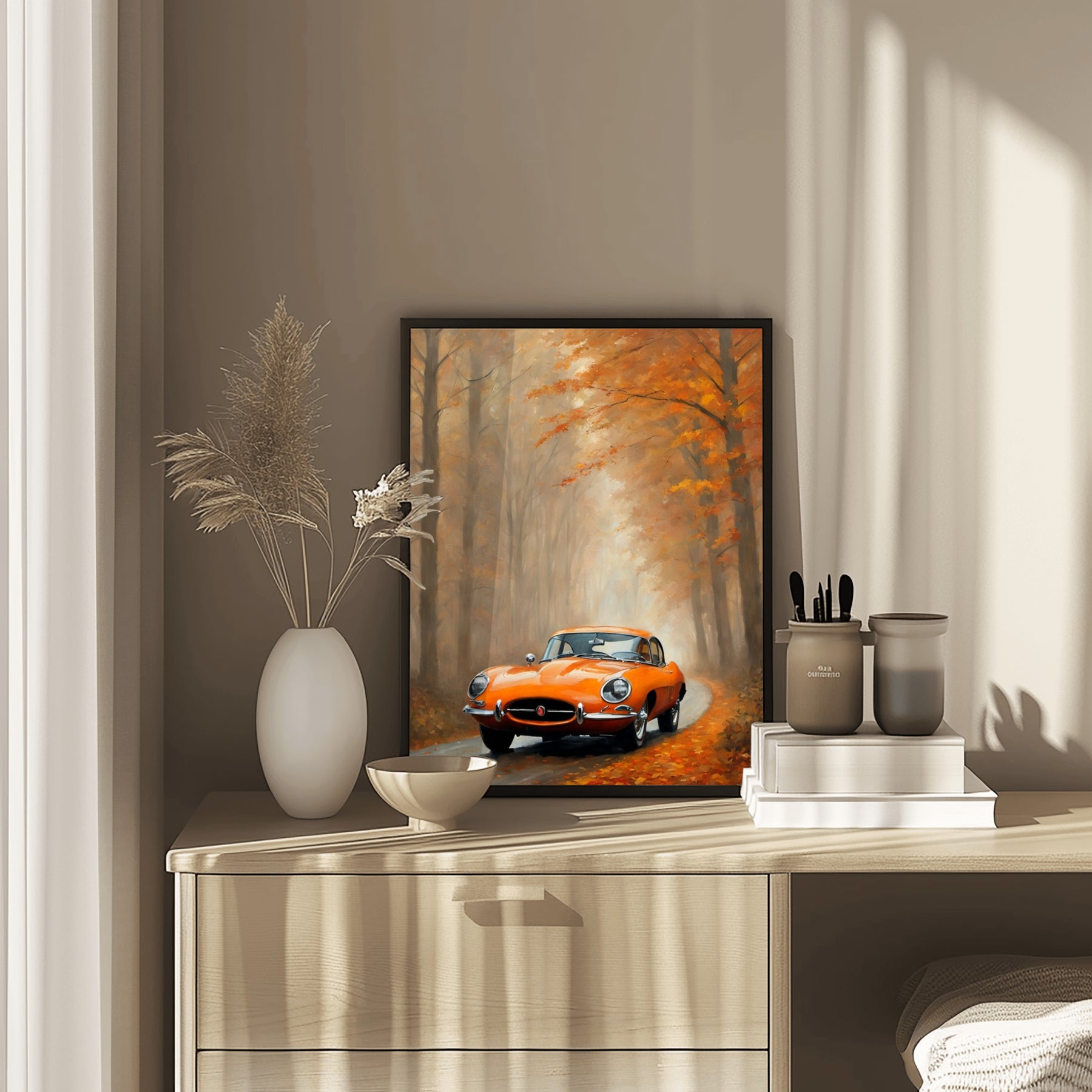 Bring a touch of nostalgia and nature into your space with this classic car on a misty autumn forest road. The dreamy oil painting print captures the magic of fall. Warm leaves drift along the quiet path. A vintage car stands ready, surrounded by fog and tall trees. Every detail in this misty road landscape artwork feels rich and inviting.