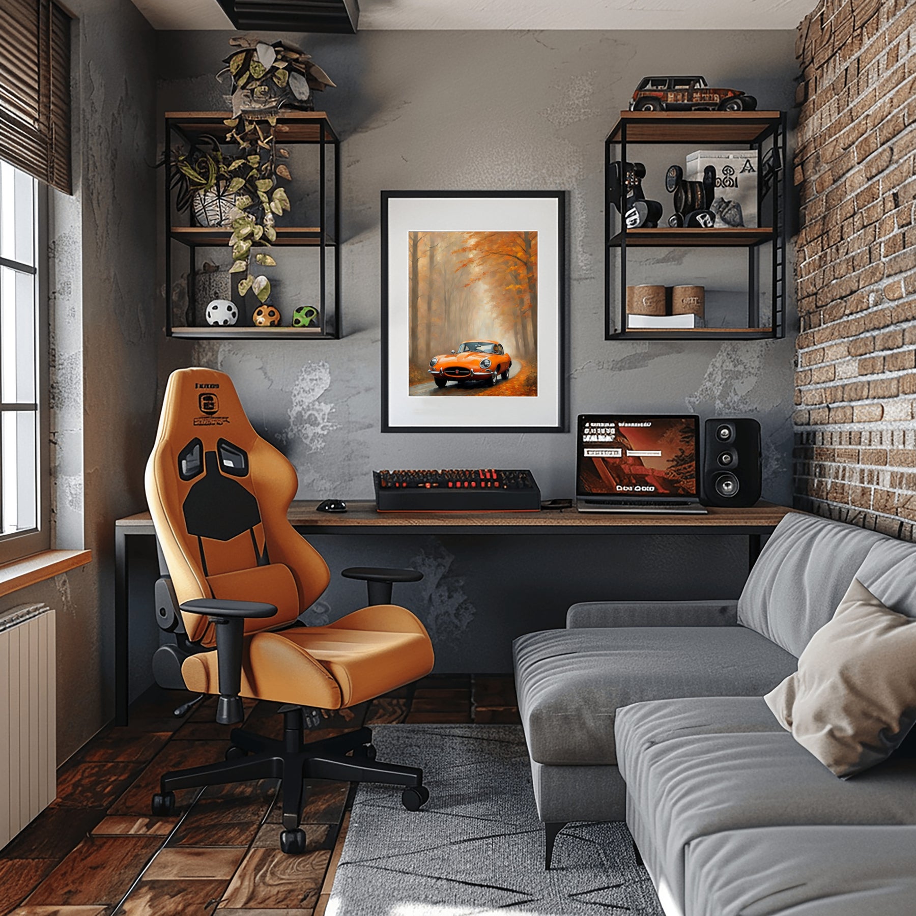 This digital print is perfect for anyone who loves timeless scenes. The classic car glows with orange colors. The road looks endless under the forest canopy. Soft mist adds a calm atmosphere. The oil painting style brings depth and a gentle texture to every section. You will find this misty road landscape artwork charming and full of feeling.