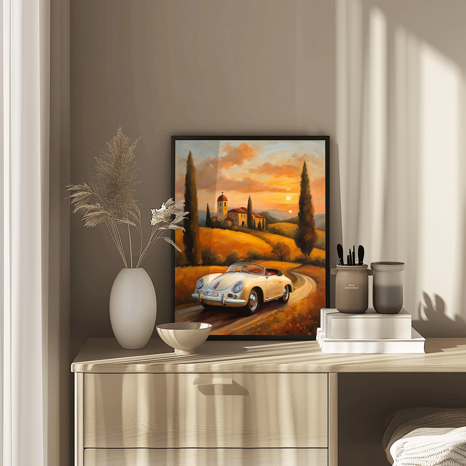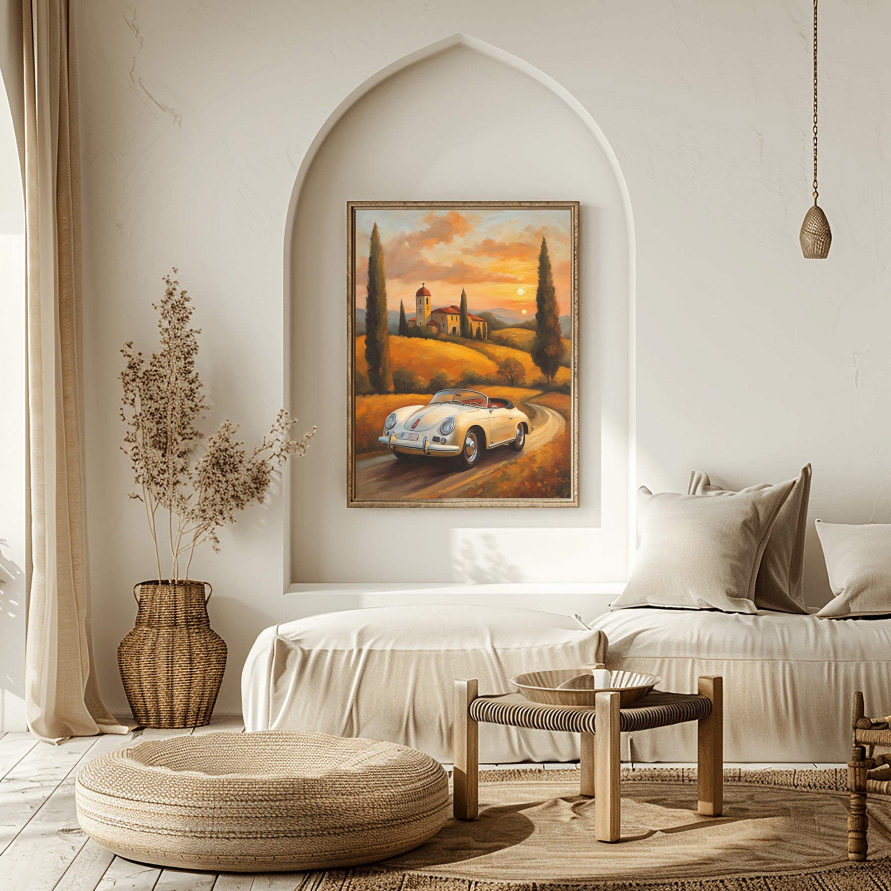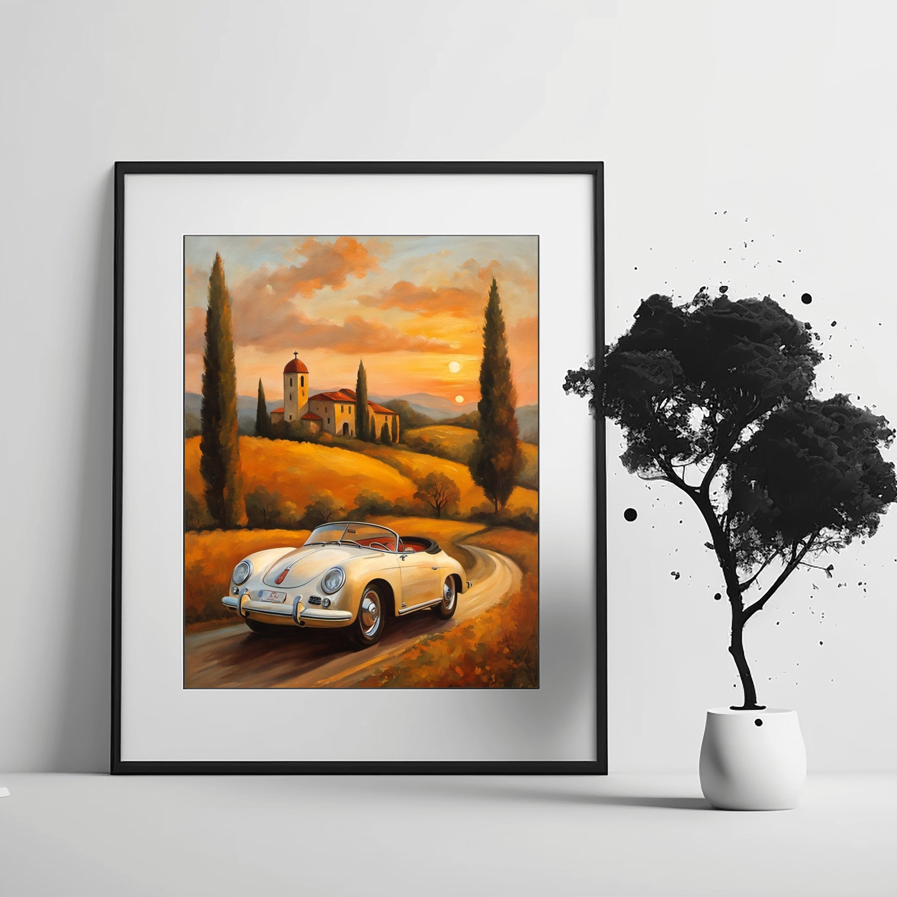 Bring a touch of nostalgia and elegance to your home with this 1950s Vintage Roadster Driving Through Tuscany Hills at Sunset. This roadster oil painting for living room captures a classic car winding along sunbathed roads, lined with tall cypress trees. The golden sunset paints the sky with warm tones, creating an inviting atmosphere.