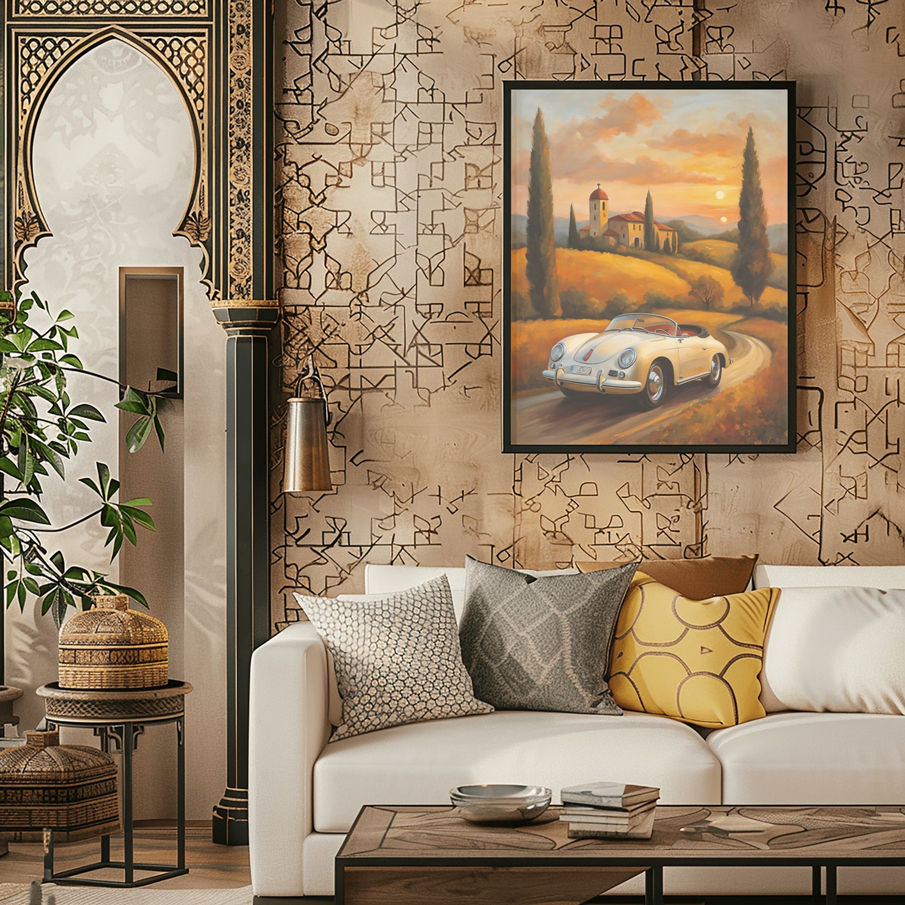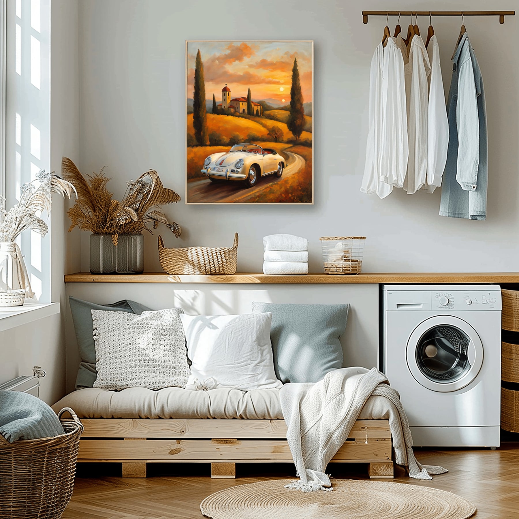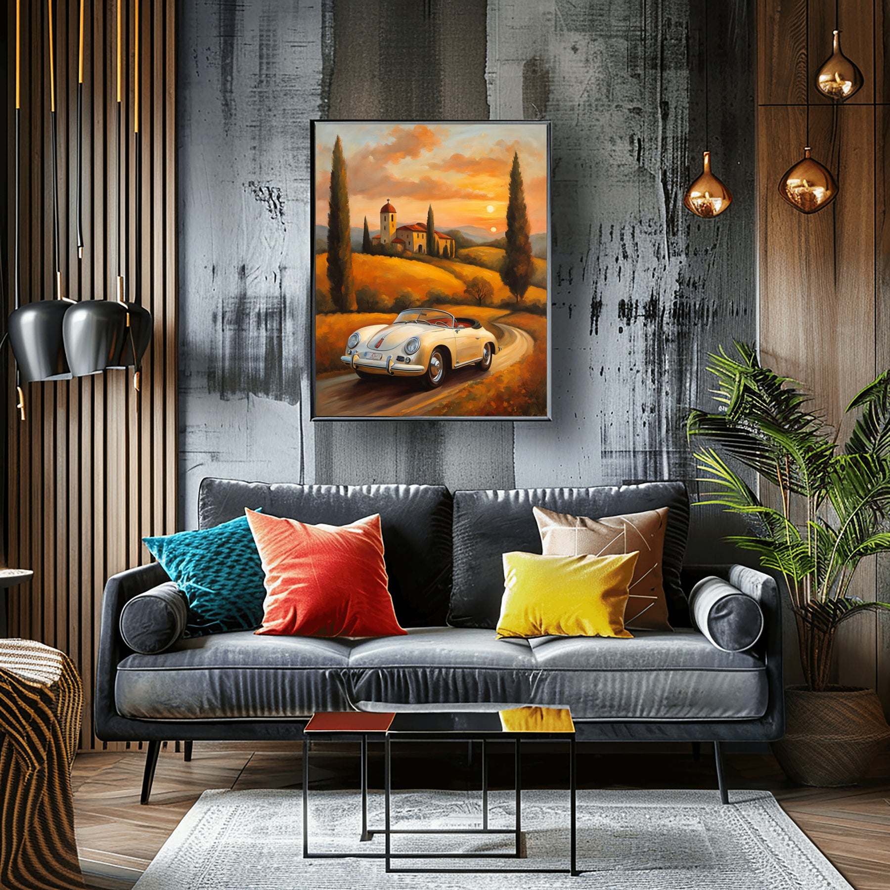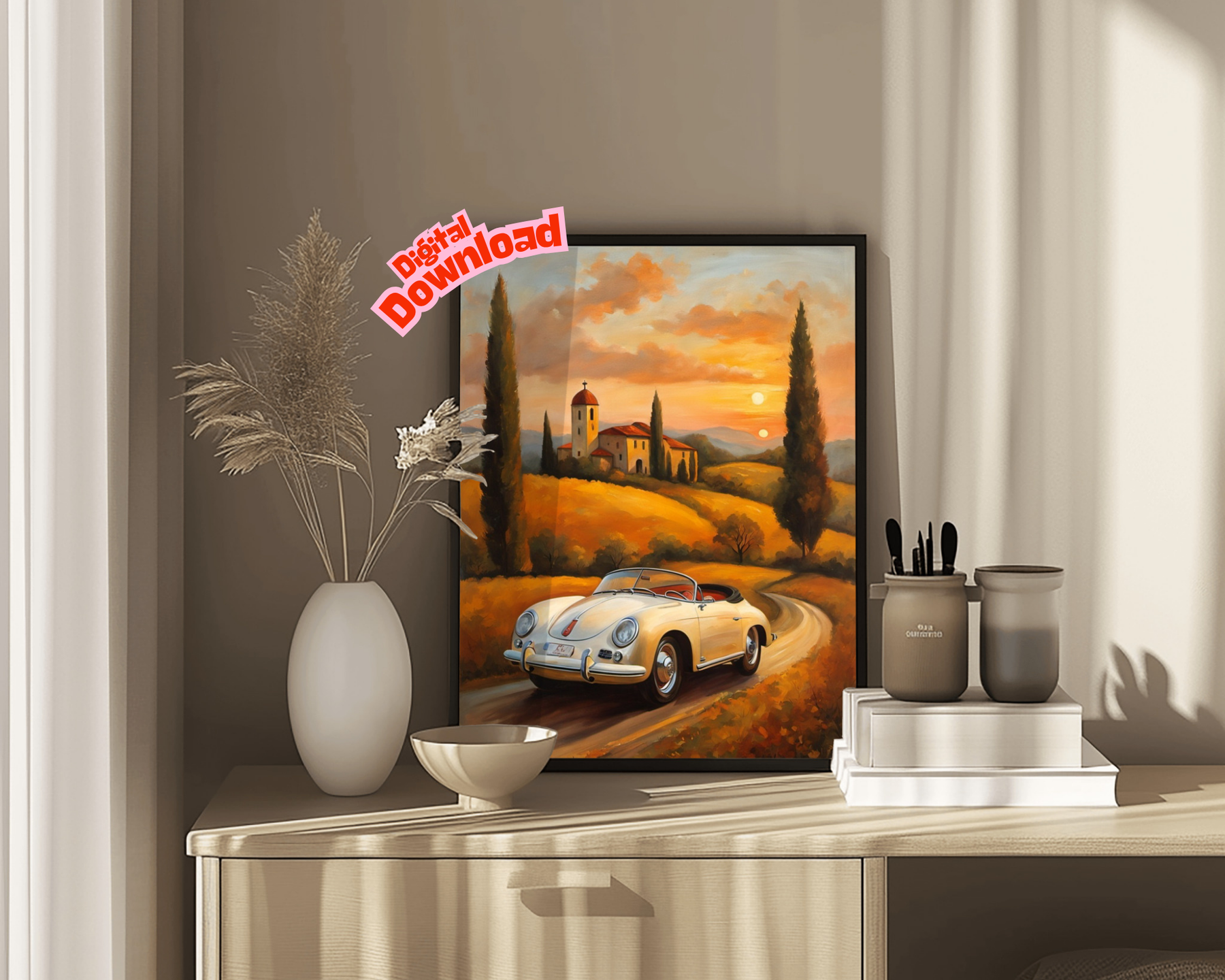 Bring a touch of nostalgia and elegance to your home with this 1950s Vintage Roadster Driving Through Tuscany Hills at Sunset. This roadster oil painting for living room captures a classic car winding along sunbathed roads, lined with tall cypress trees. The golden sunset paints the sky with warm tones, creating an inviting atmosphere.