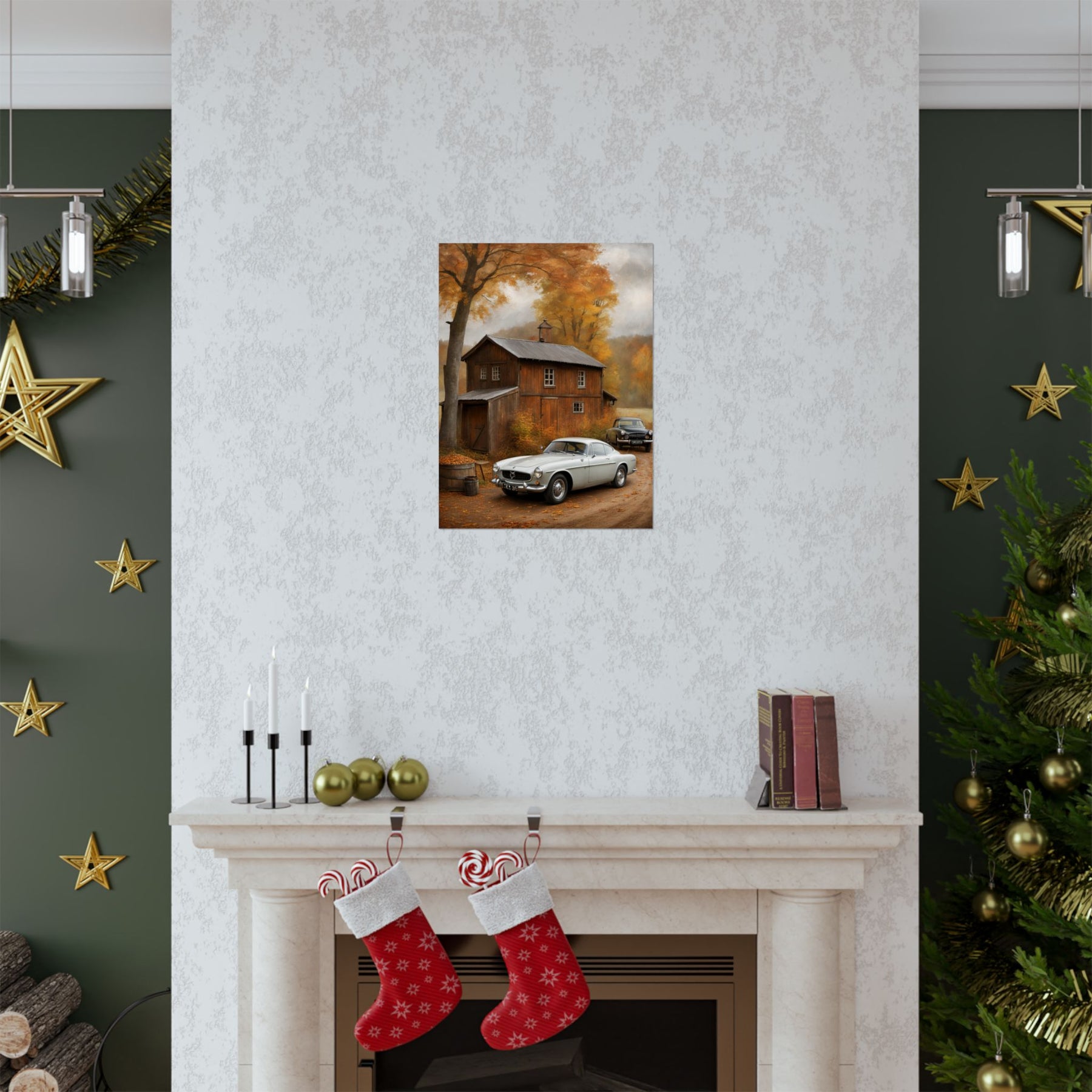 Classic car wall art for home decor featuring vintage cars near a cozy autumn house