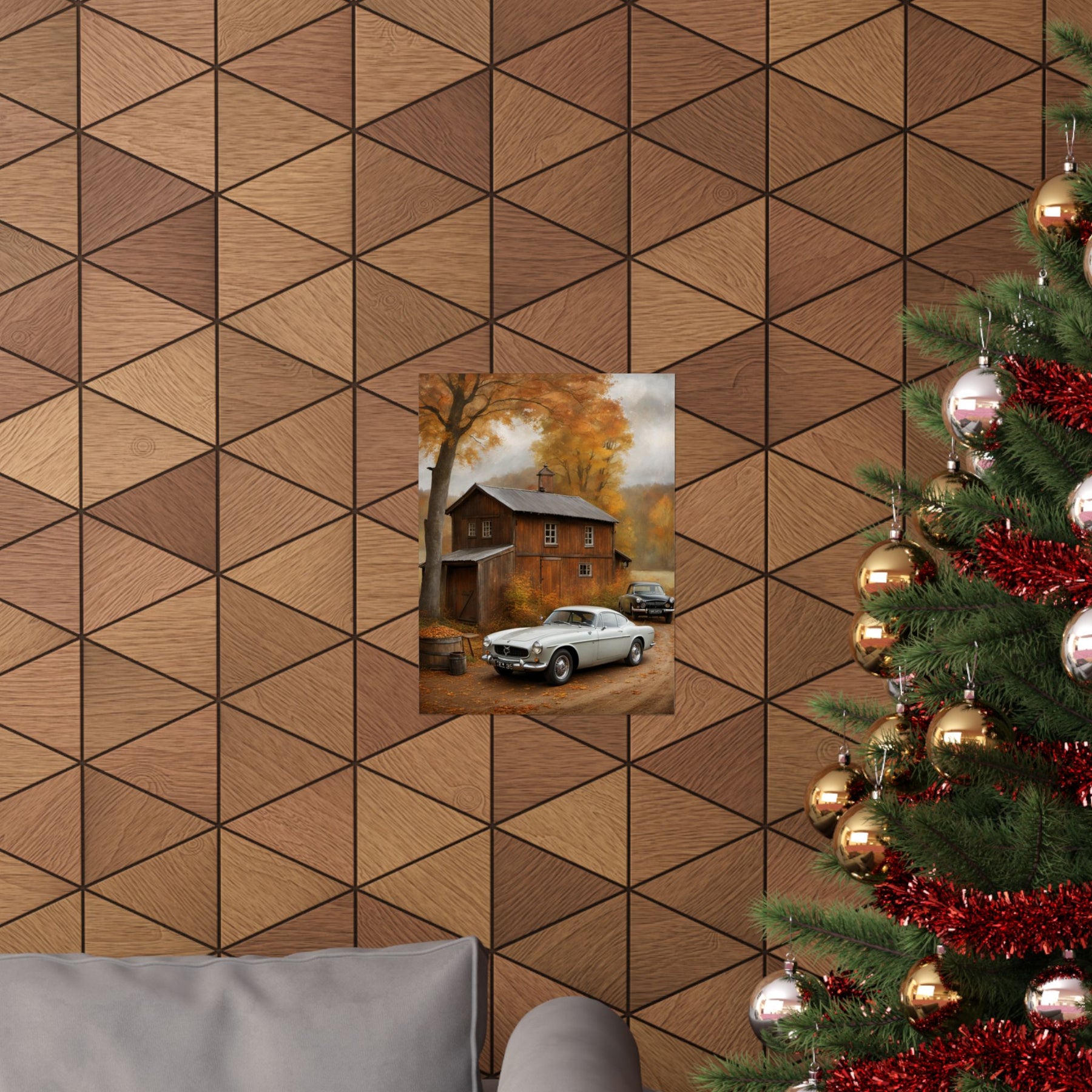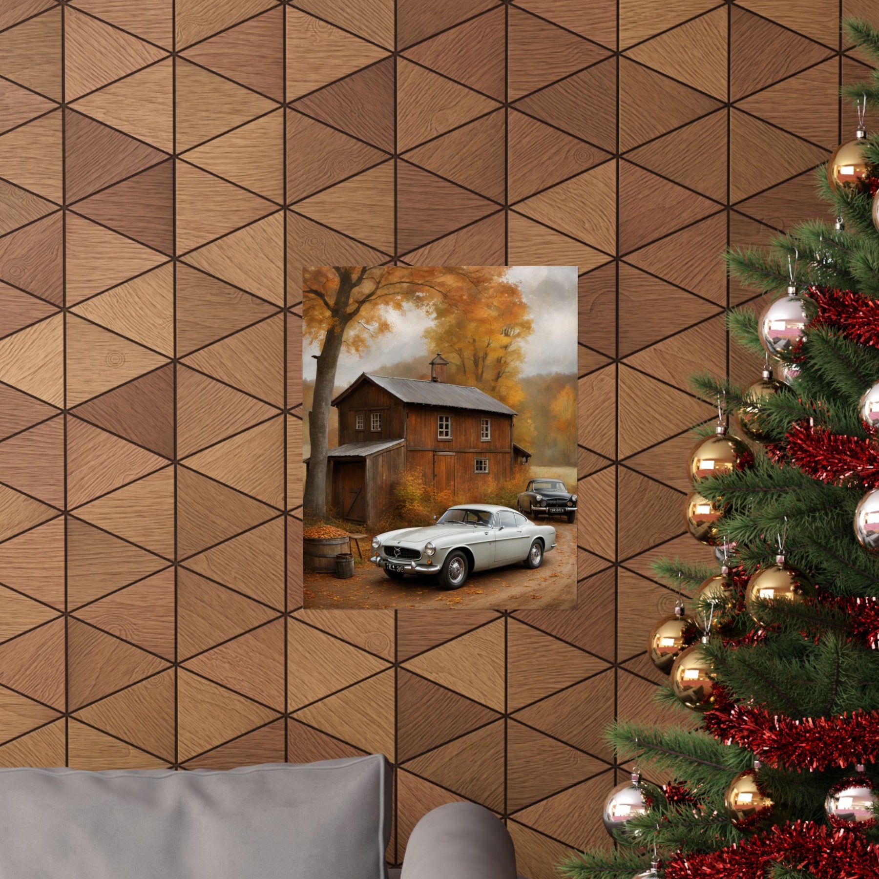 Classic car wall art for home decor featuring a silver car and autumn scenery