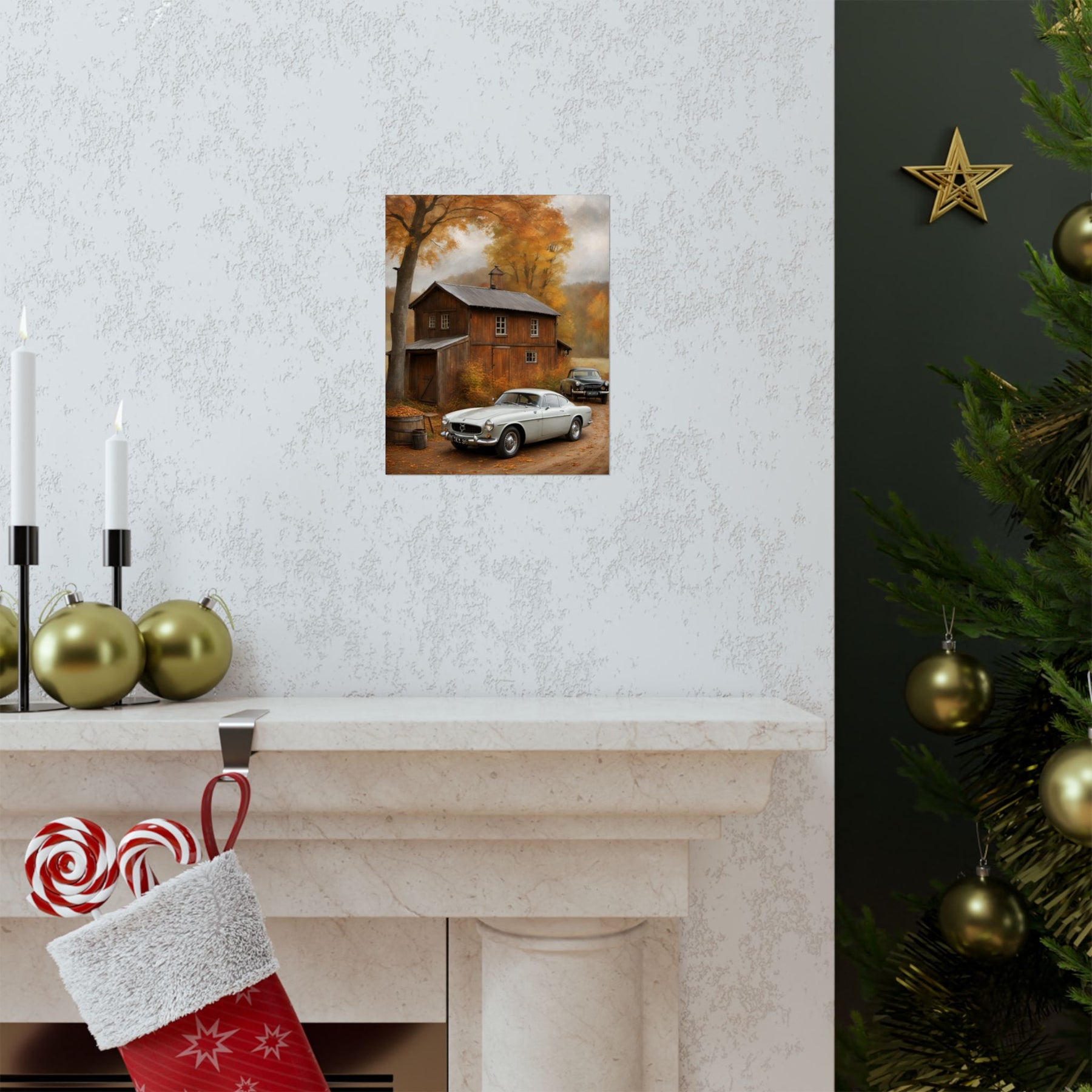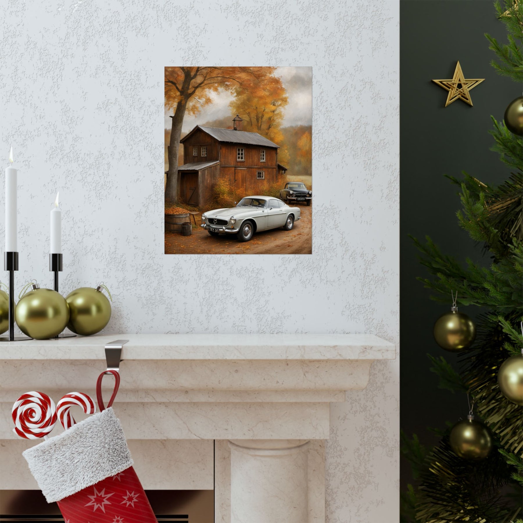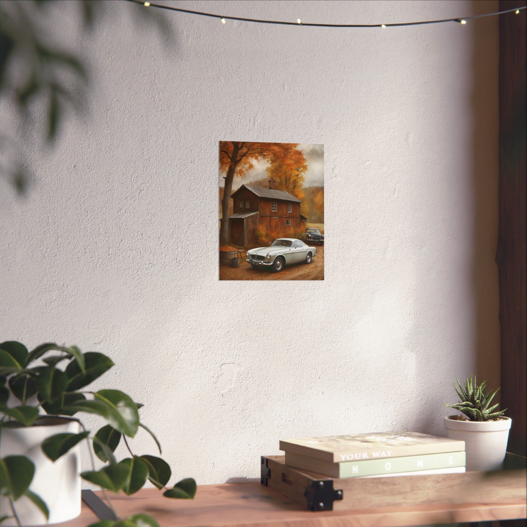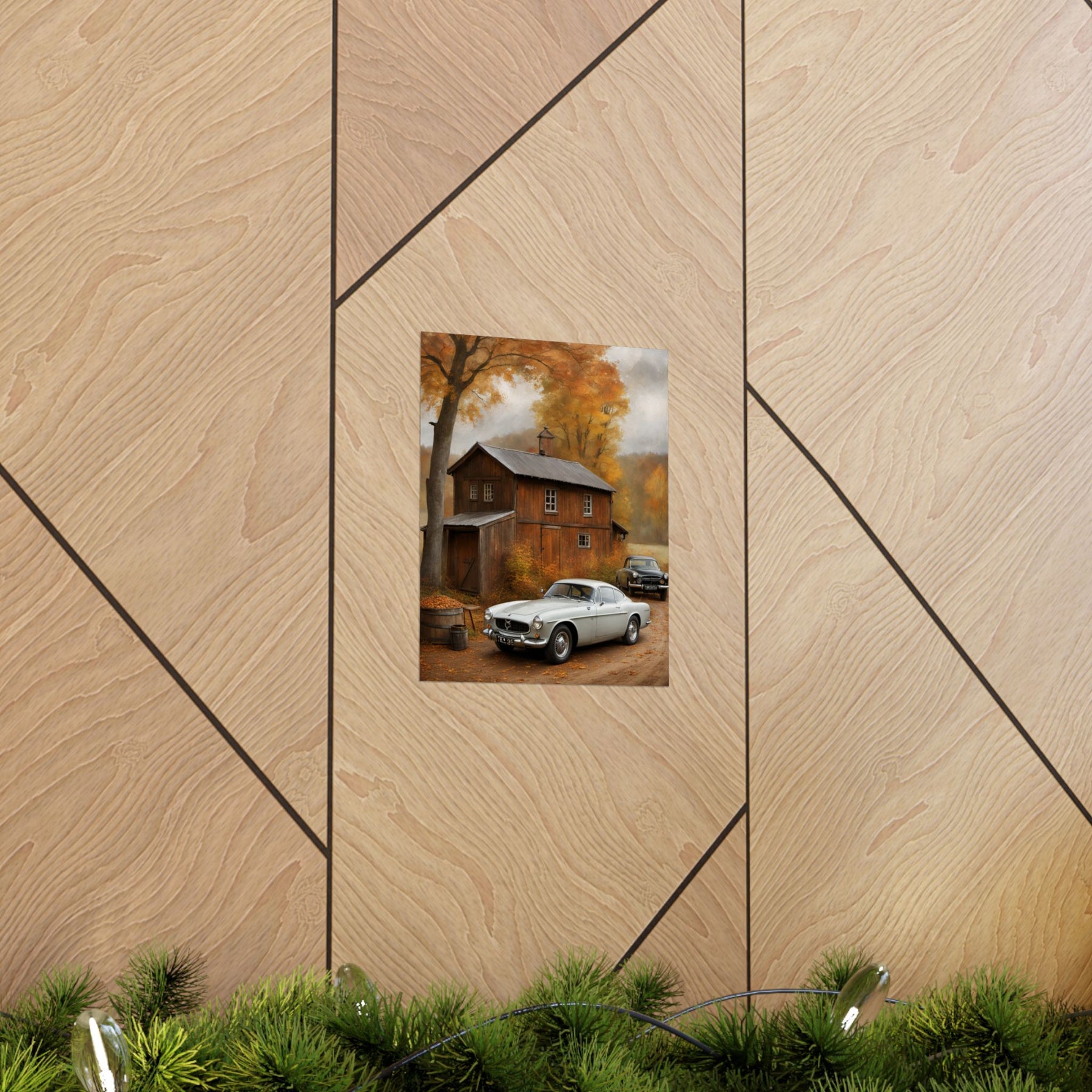 Classic car wall art for home decor featuring a vintage car in a cozy autumn setting