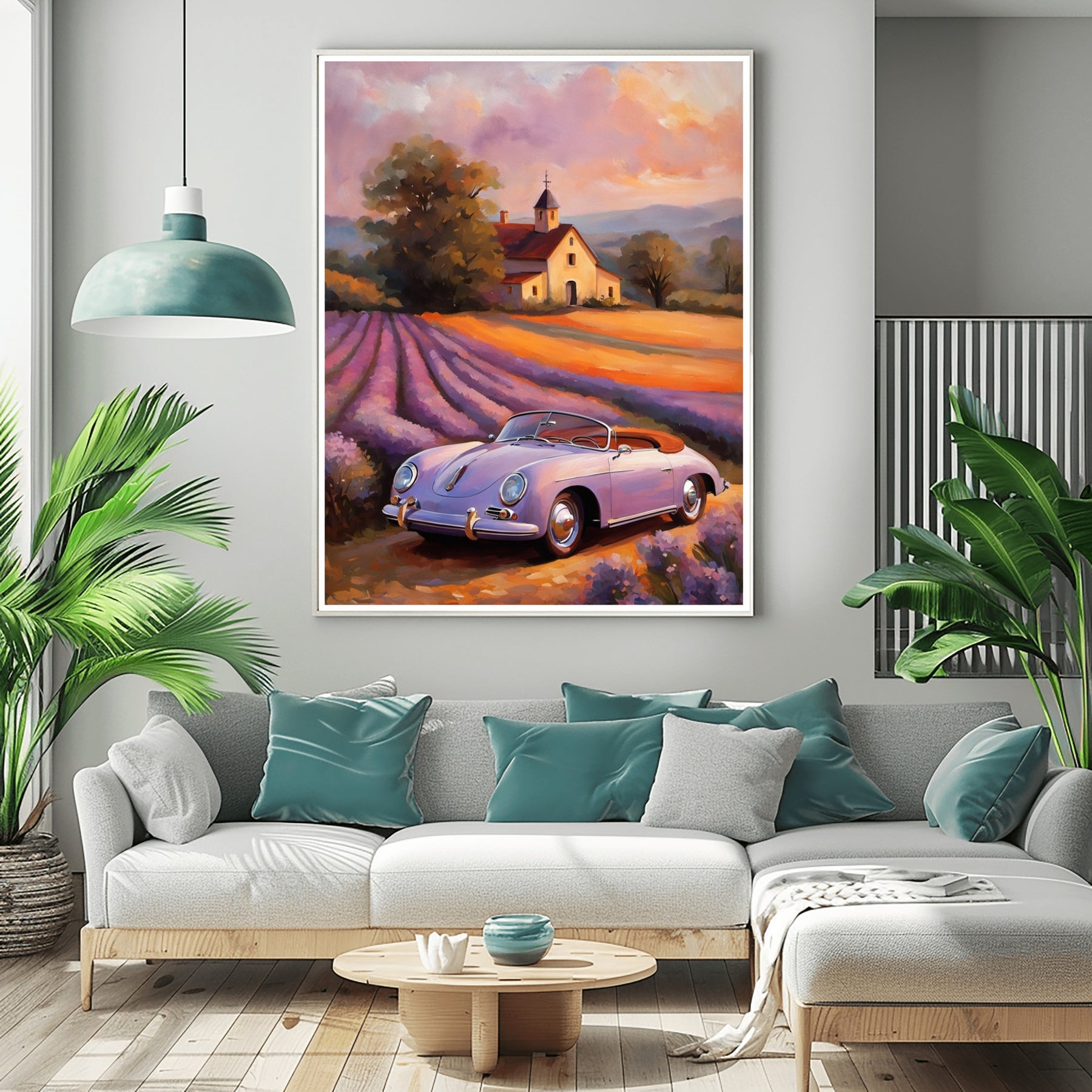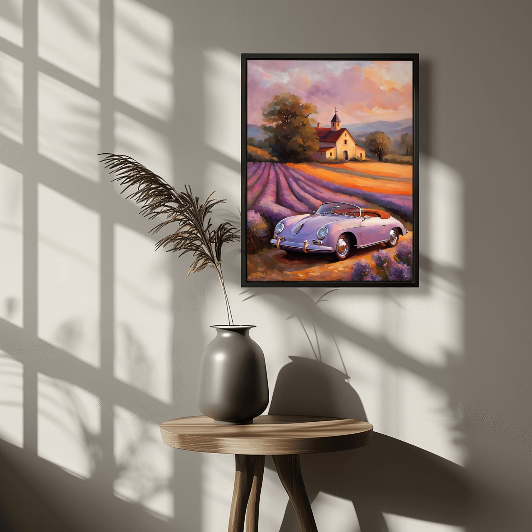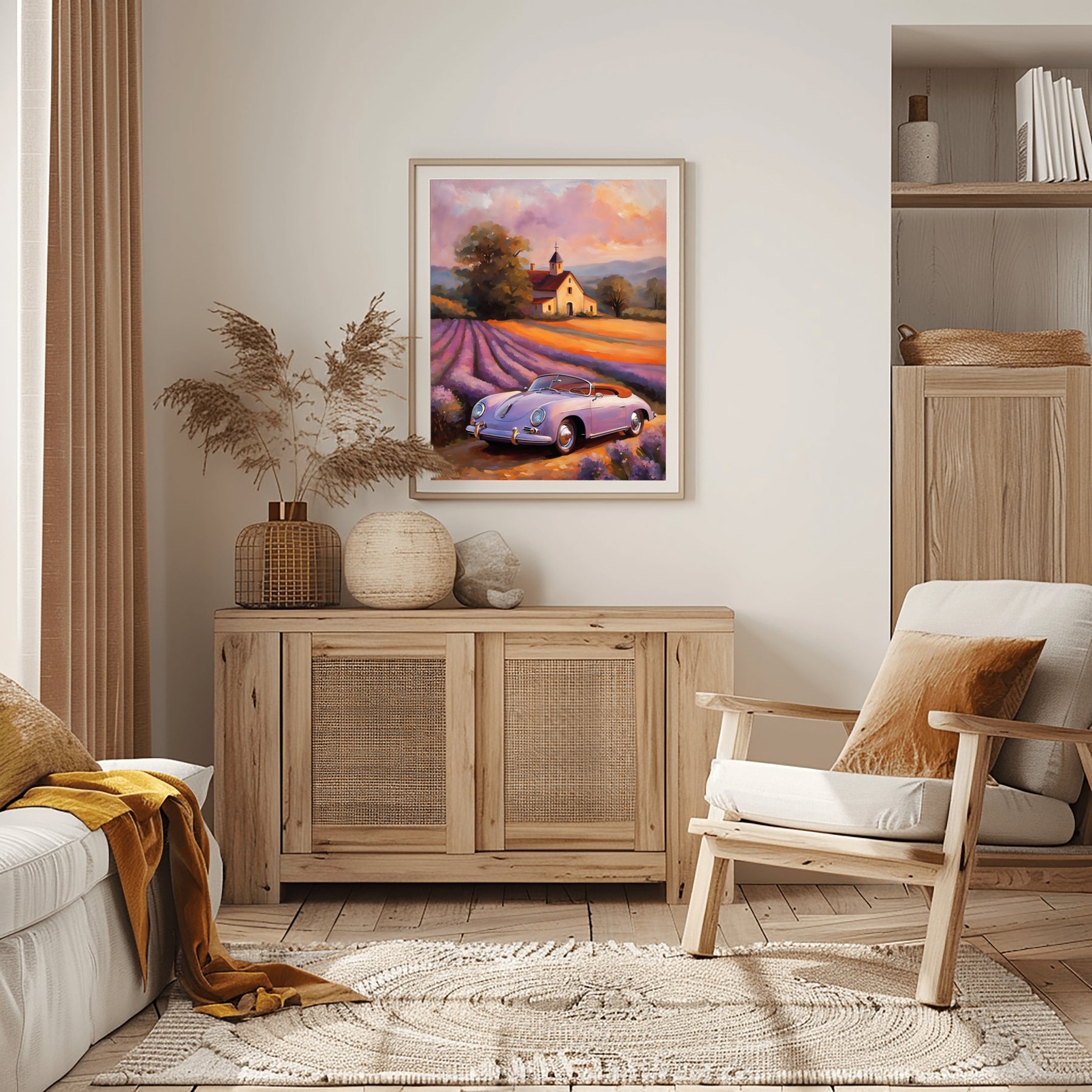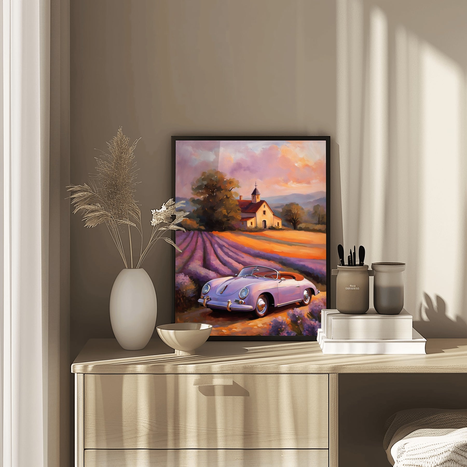 Bring a touch of nostalgia and beauty to your living space with this vintage car and lavender field print. The artwork shows a classic 1950s speedster parked gently beside lush, blooming lavender. Soft summer light makes the colors glow. You can almost smell the lavender in the air and hear the quiet countryside.