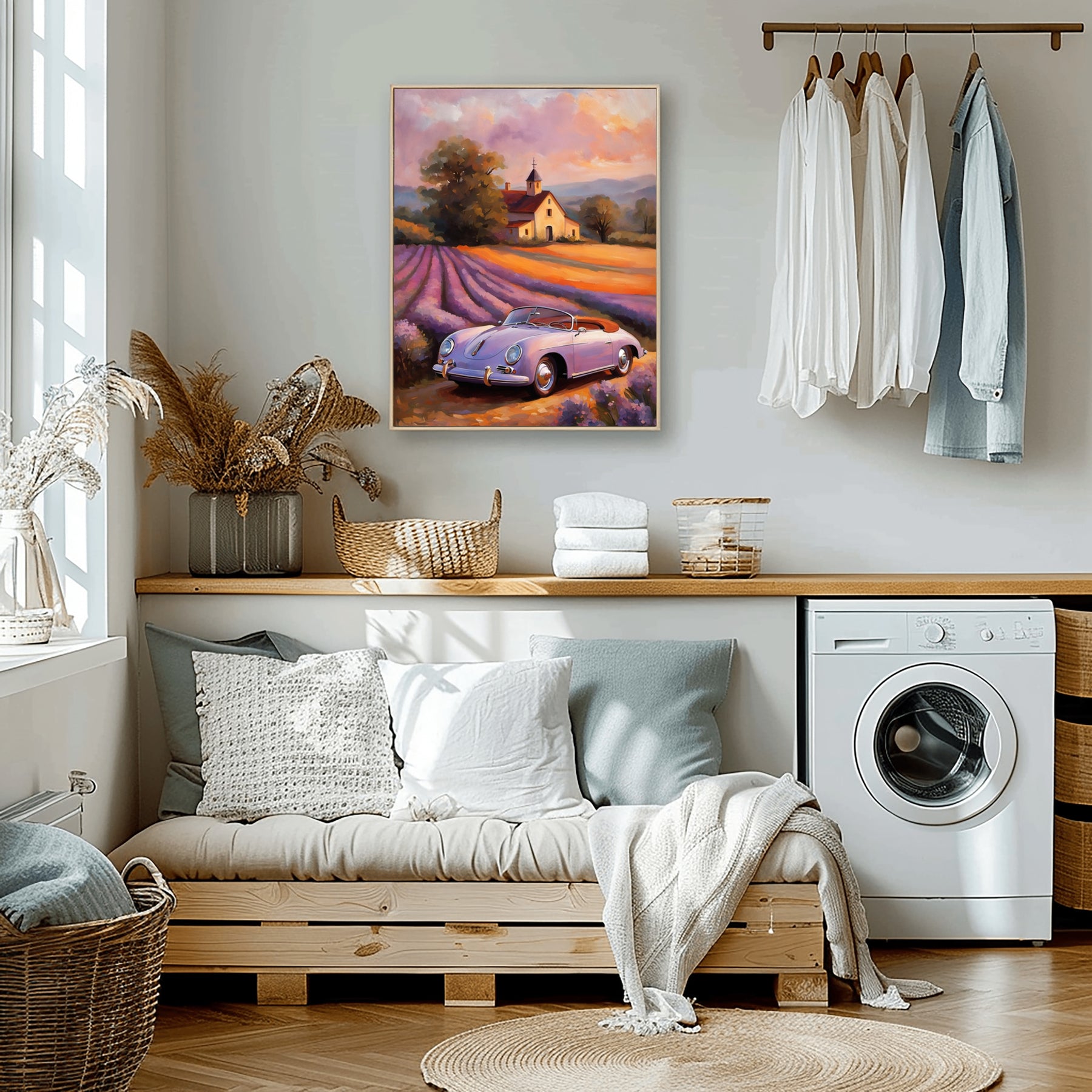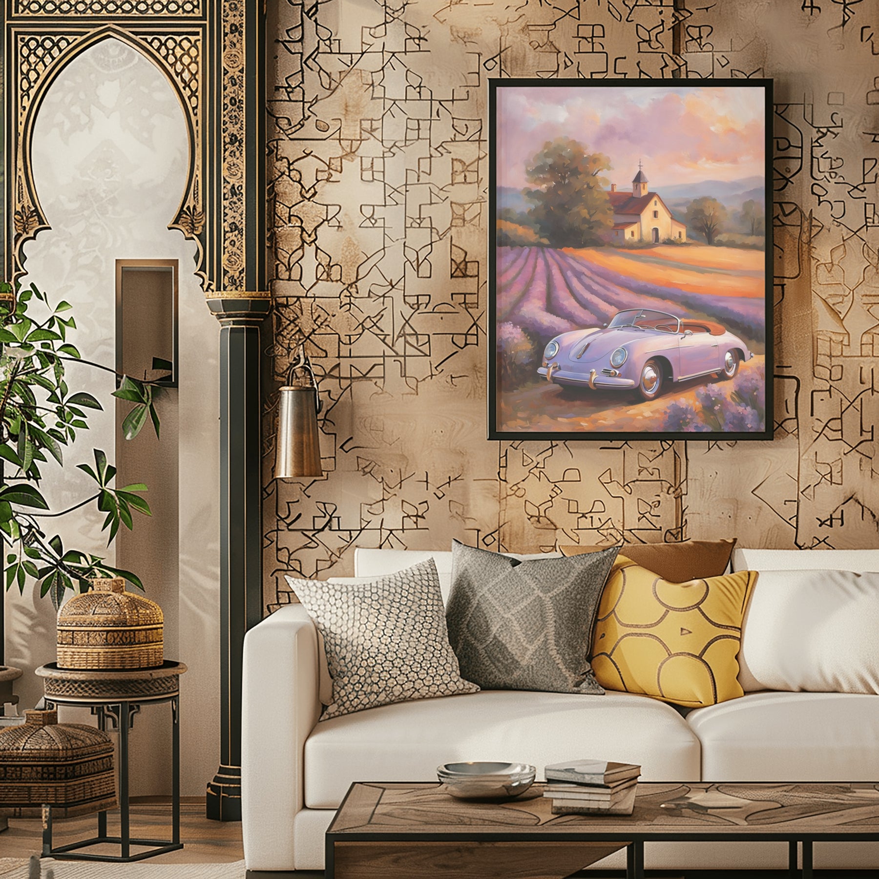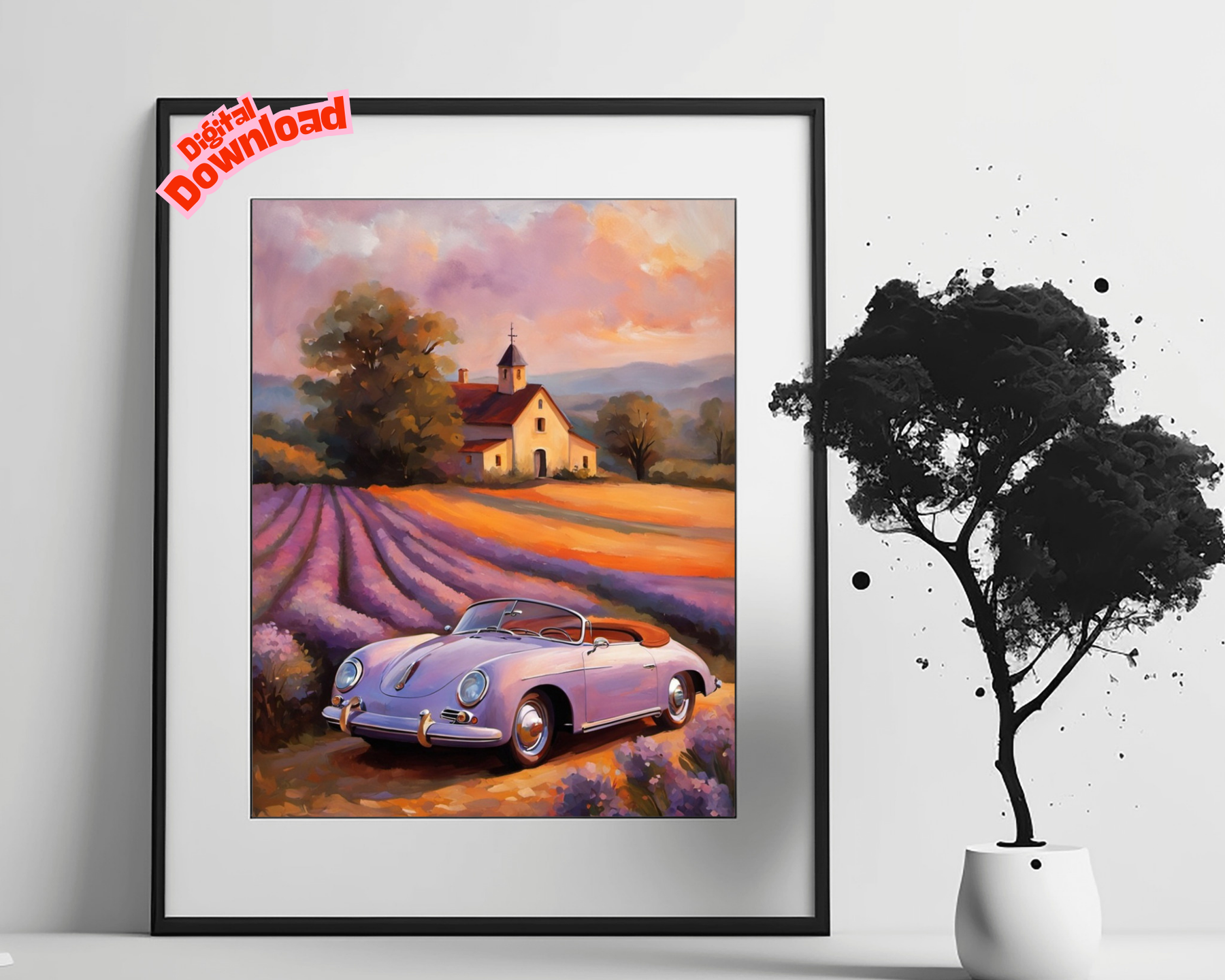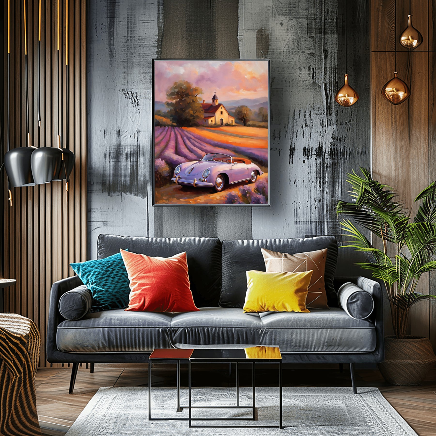 Bring a touch of nostalgia and beauty to your living space with this vintage car and lavender field print. The artwork shows a classic 1950s speedster parked gently beside lush, blooming lavender. Soft summer light makes the colors glow. You can almost smell the lavender in the air and hear the quiet countryside.